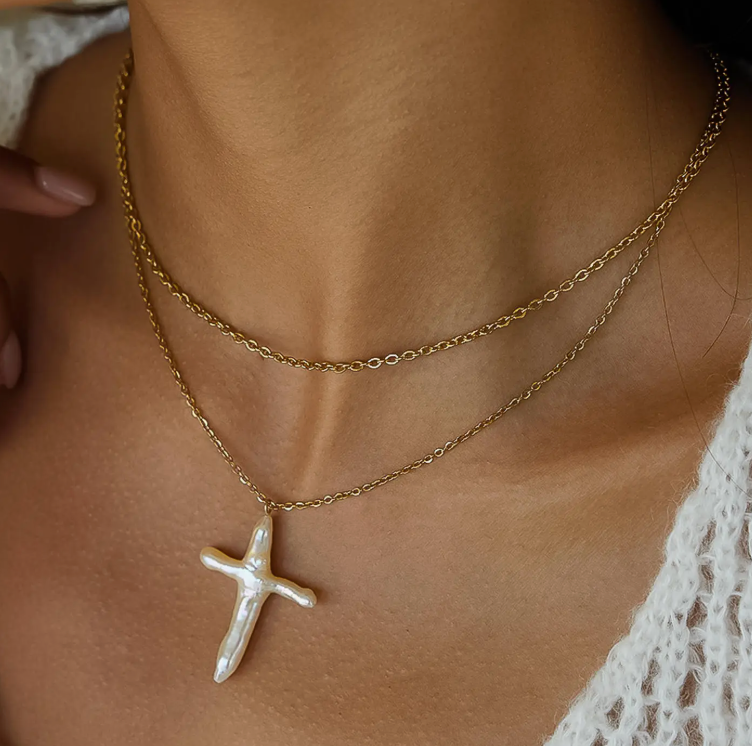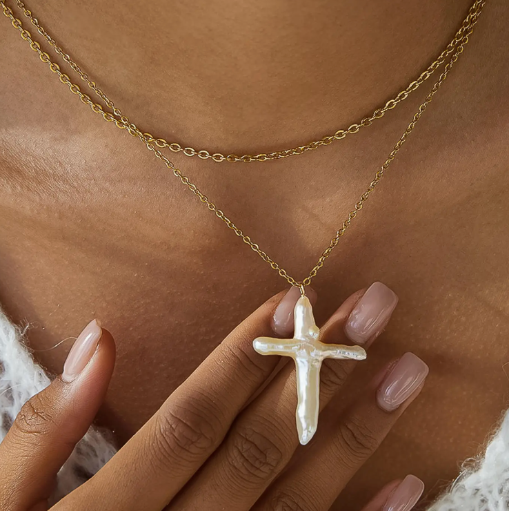 Aurise 18K Gold Non-Tarnish Freshwater Pearl Cross Necklace