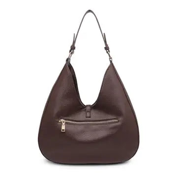Introducing a hobo bag that effortlessly blends edge with elegance, crafted from pebbled vegan leather. The exterior boasts stud embellishments and gold hardware, while the turn lock loop closure adds a touch of sophistication. Inside, a printed fabric lining, one zip pocket, and two slip pockets ensure your essentials are stylishly organized.