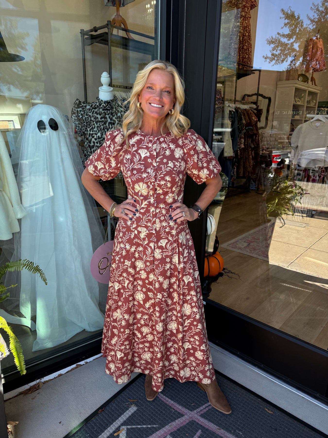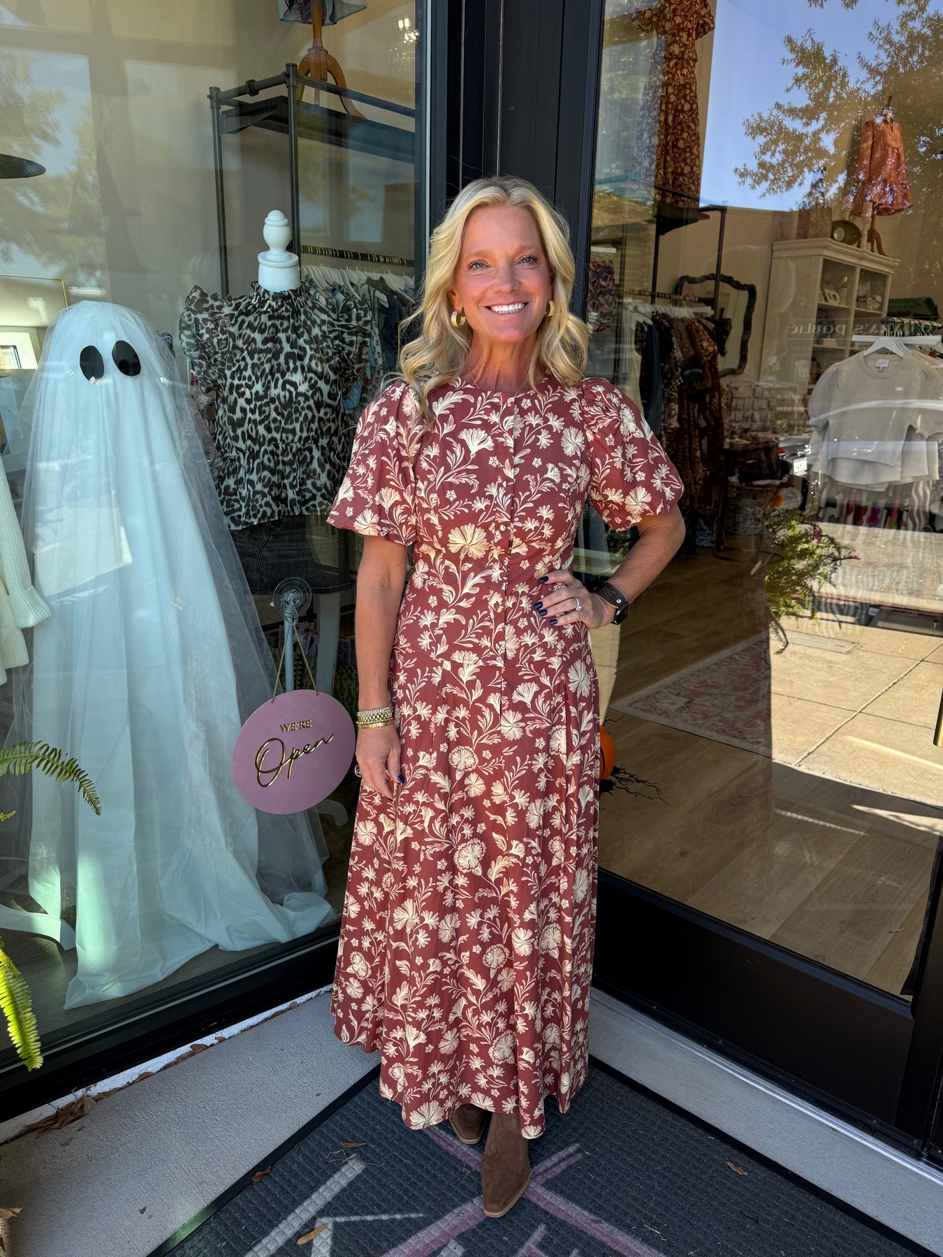 The Top is Button Front with Crew neck and Puff Sleeves