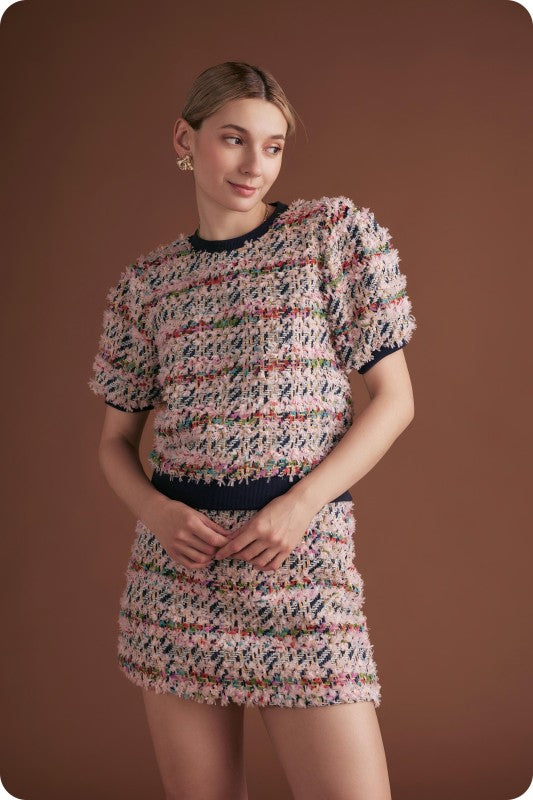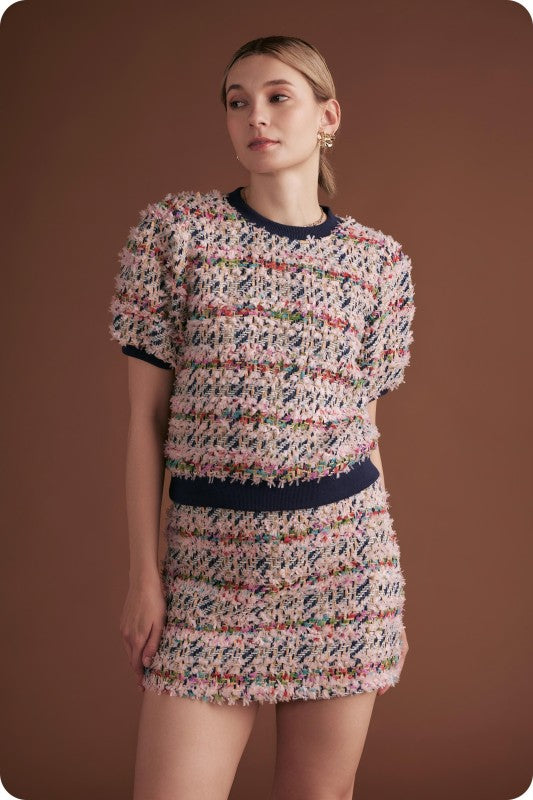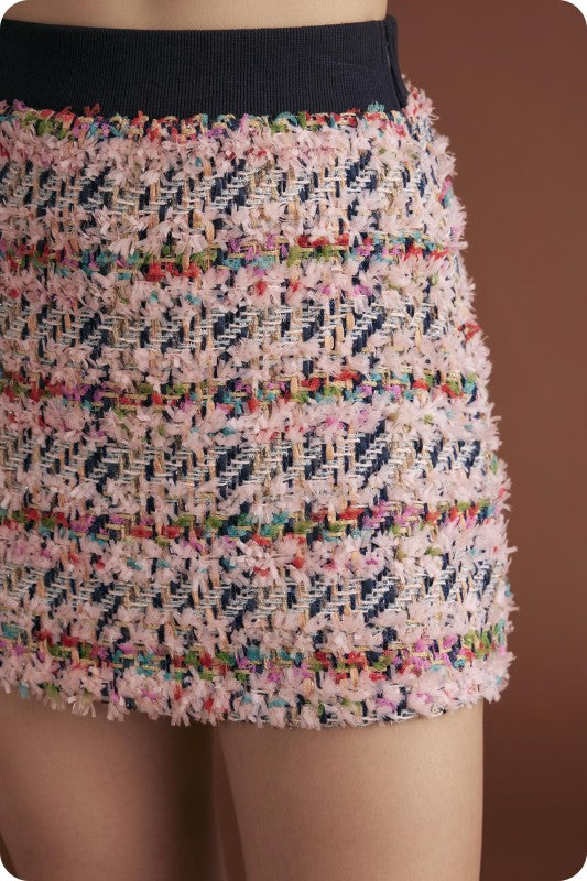 Rib contrast mini skirt in pink and navy multi color texture lurex tweed fabric