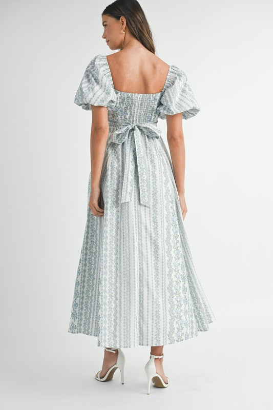 Short puff sleeve floral print babydoll midi dress with square neckline detail.