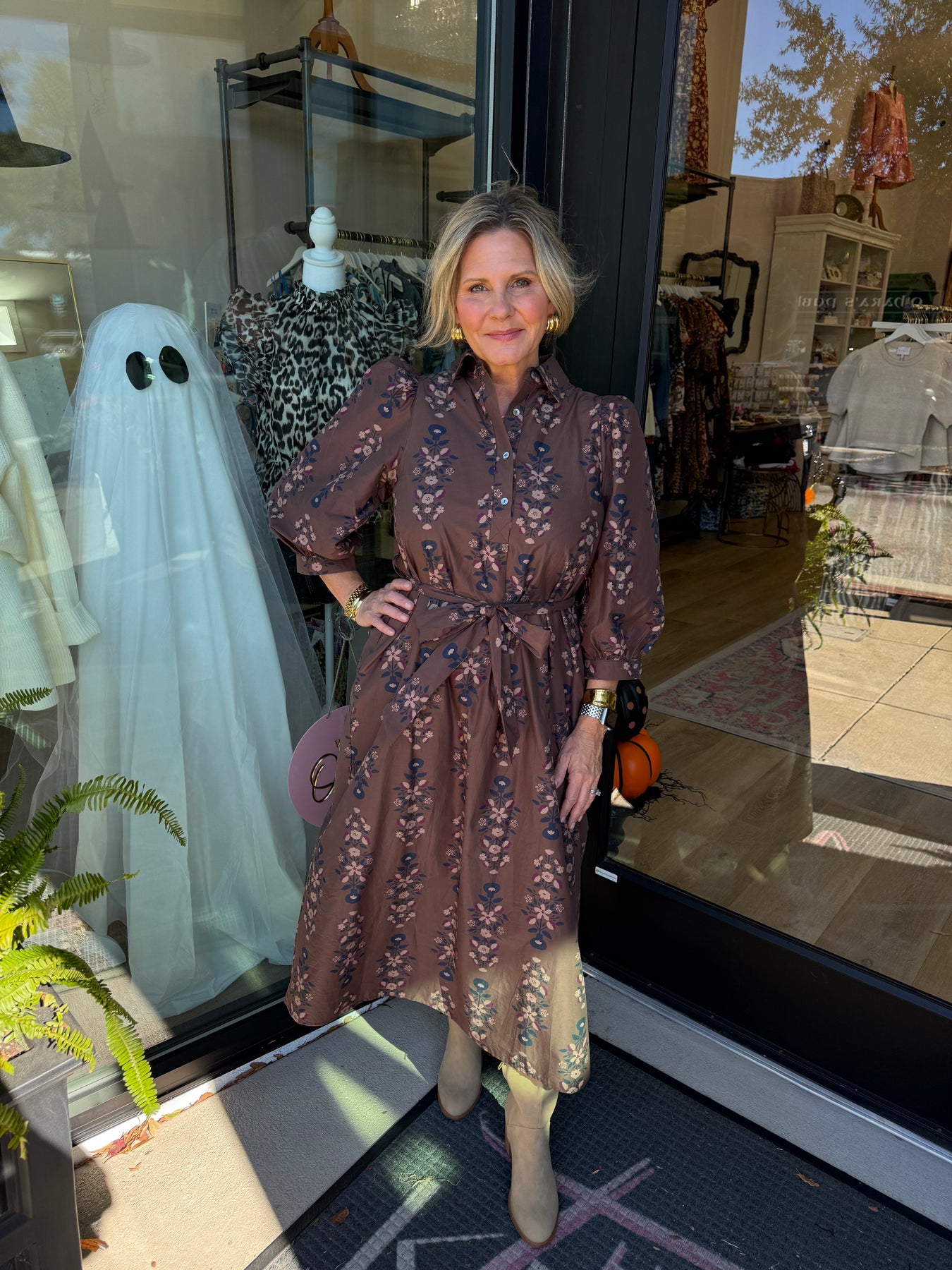 Brown Botanical Print Waist Tie Midi Dress