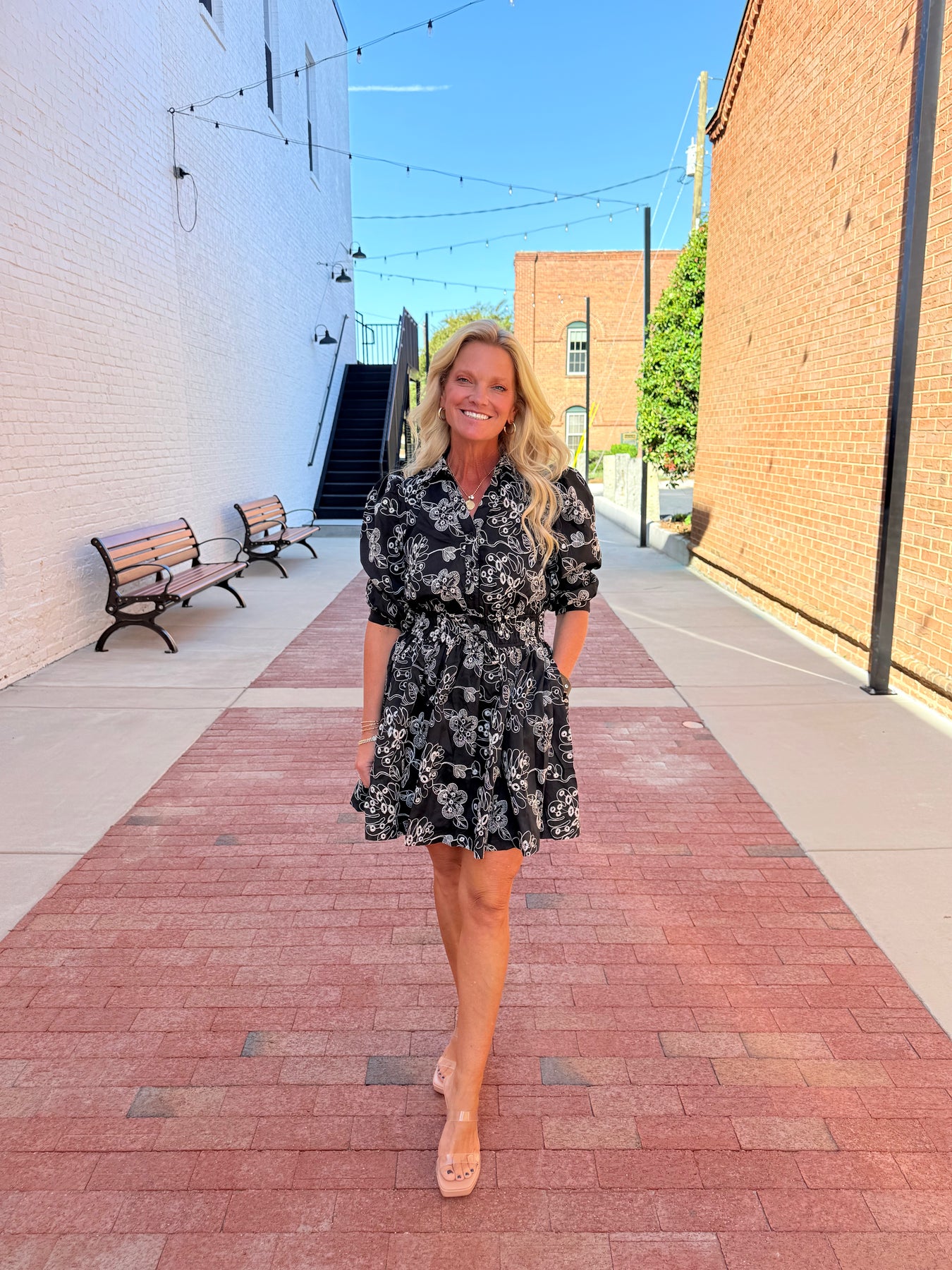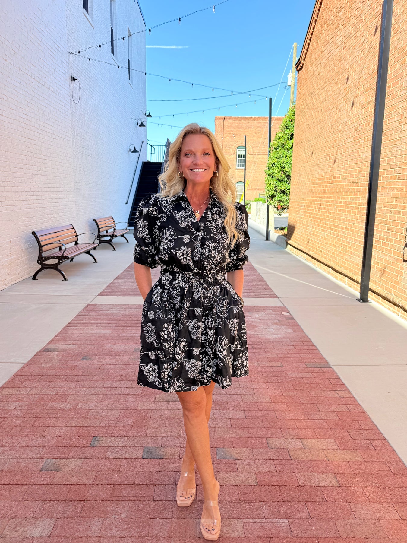 Floral print mini dress featuring a collared neckline with partial button front and puff shoulders.