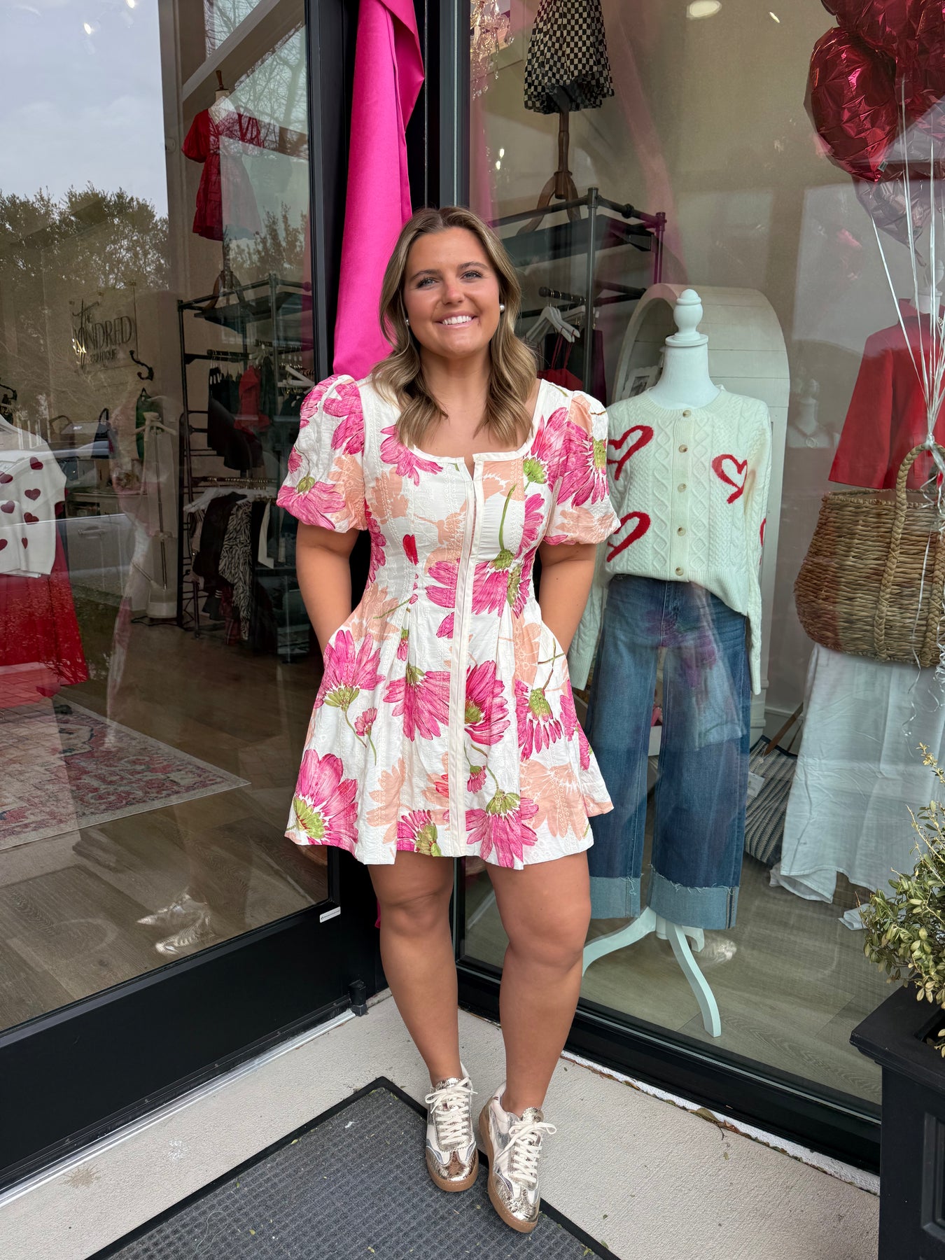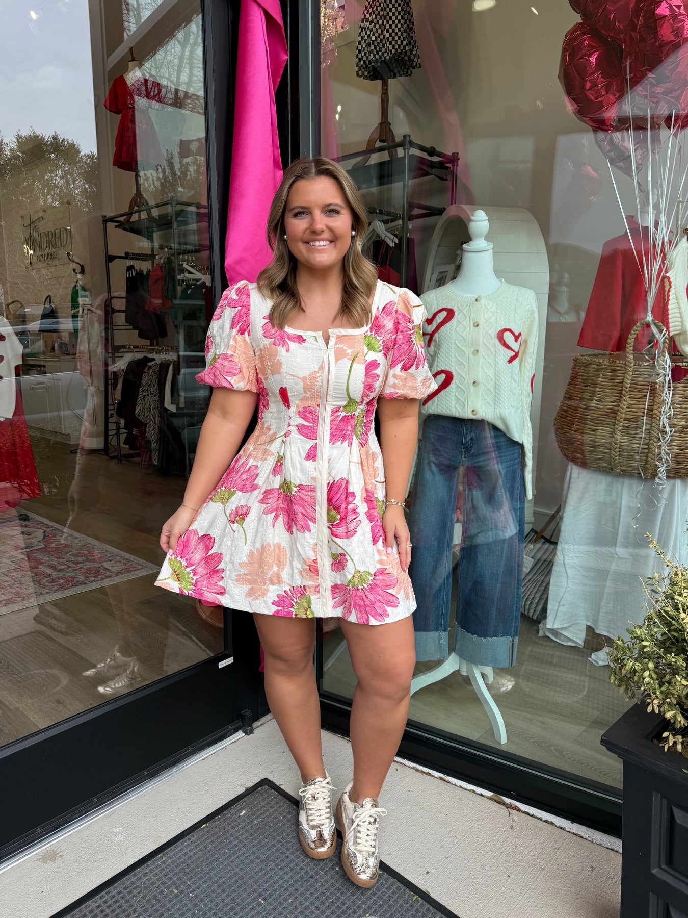 A floral-print mini dress featuring a square neckline and puff sleeves.