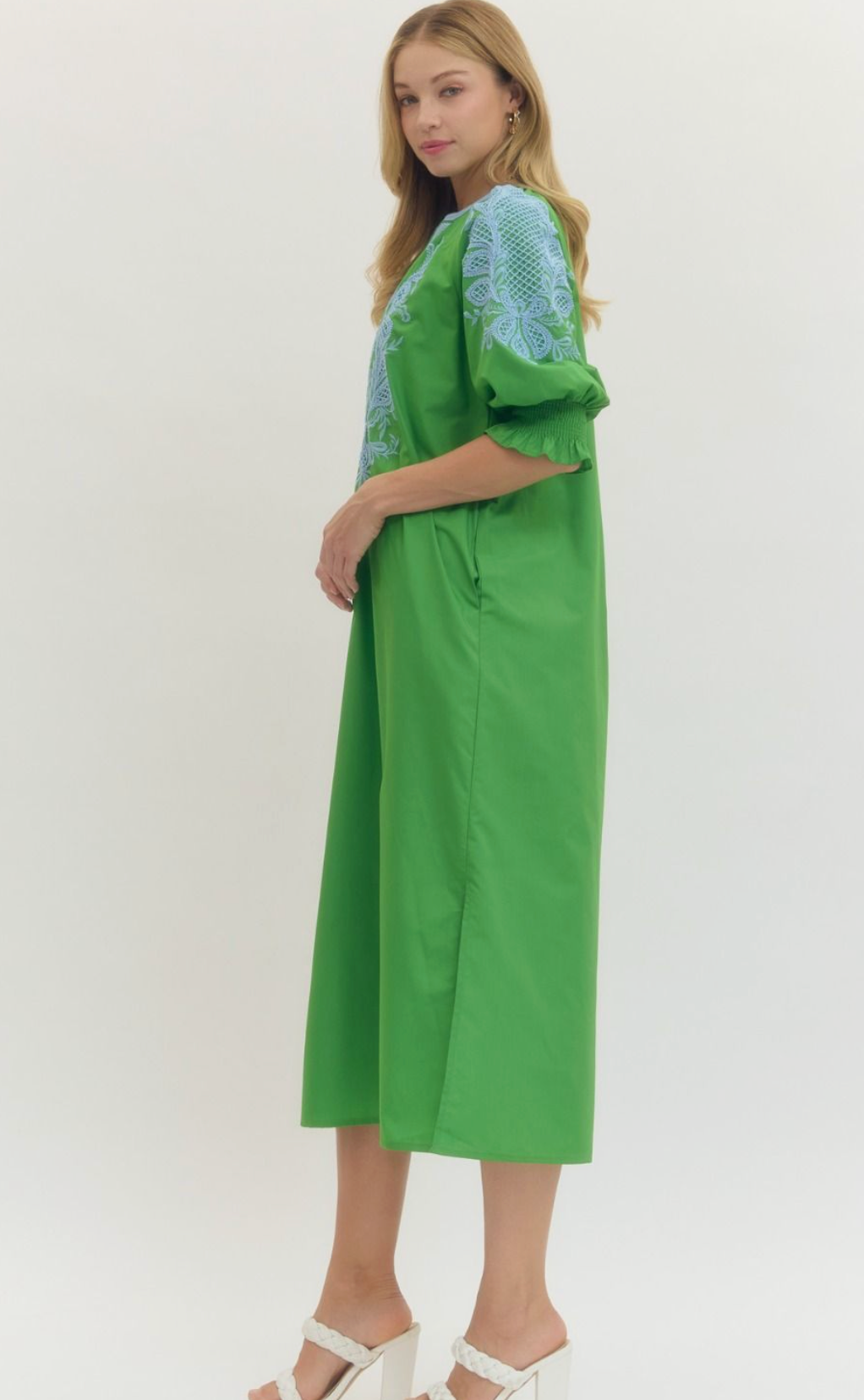 Embroidered V-neck half sleeve midi dress featuring contrast trim at neckline and sleeve.