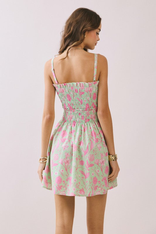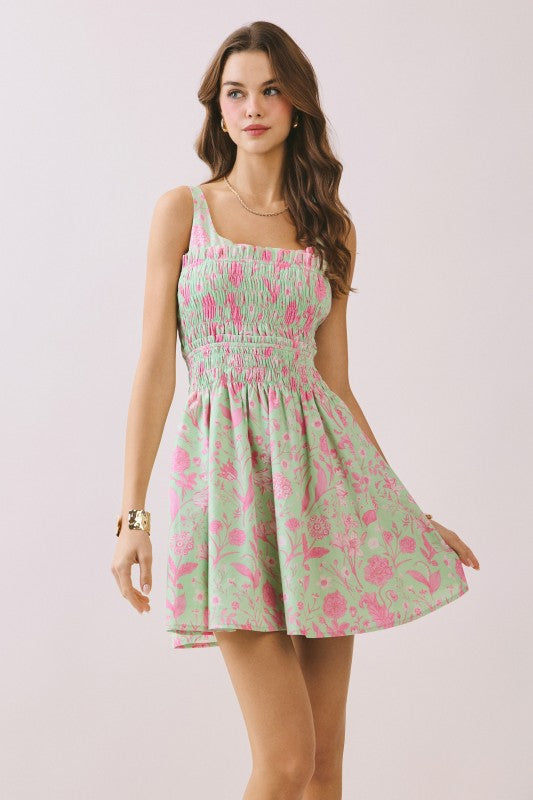 Green Floral Print Smocked Bodice Wide Strap Dress
