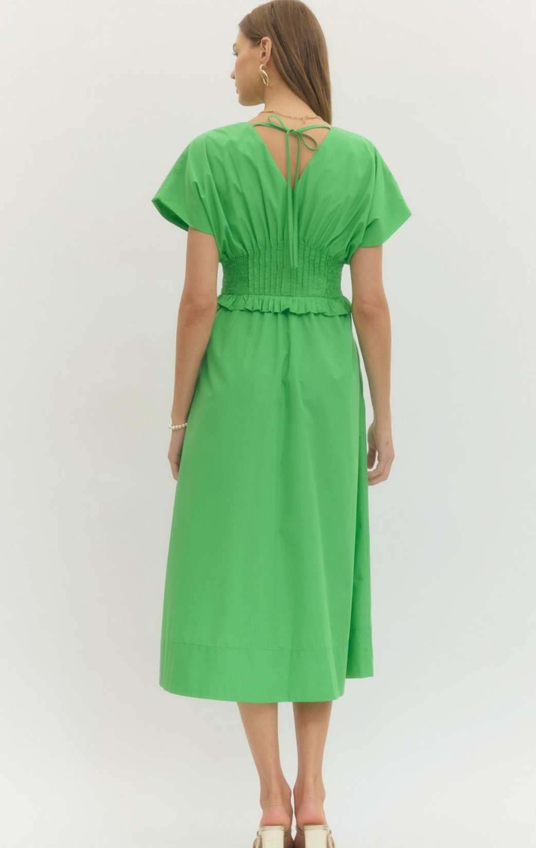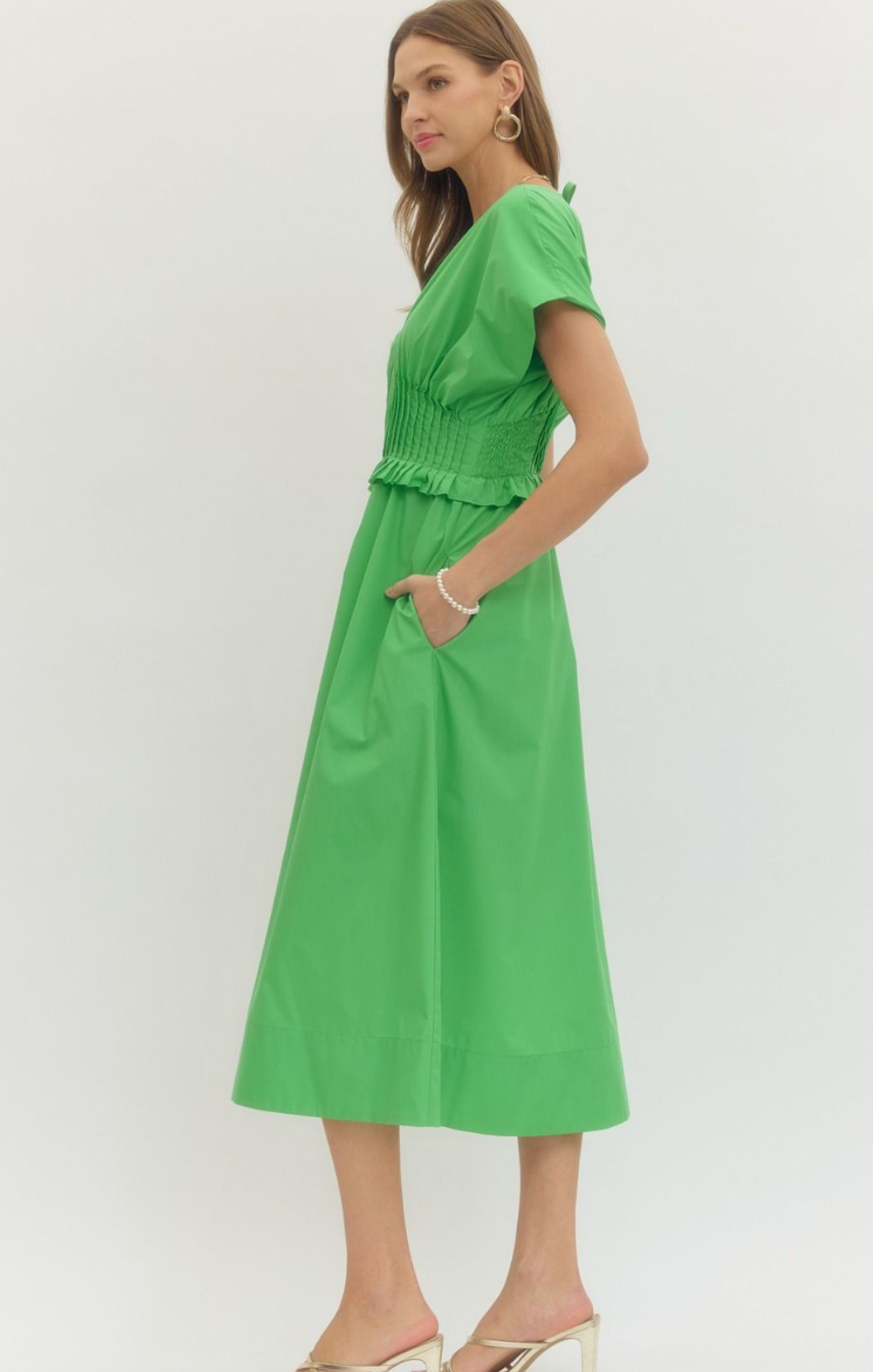 Solid short sleeve midi dress featuring smocked waist with pleated trim detail.