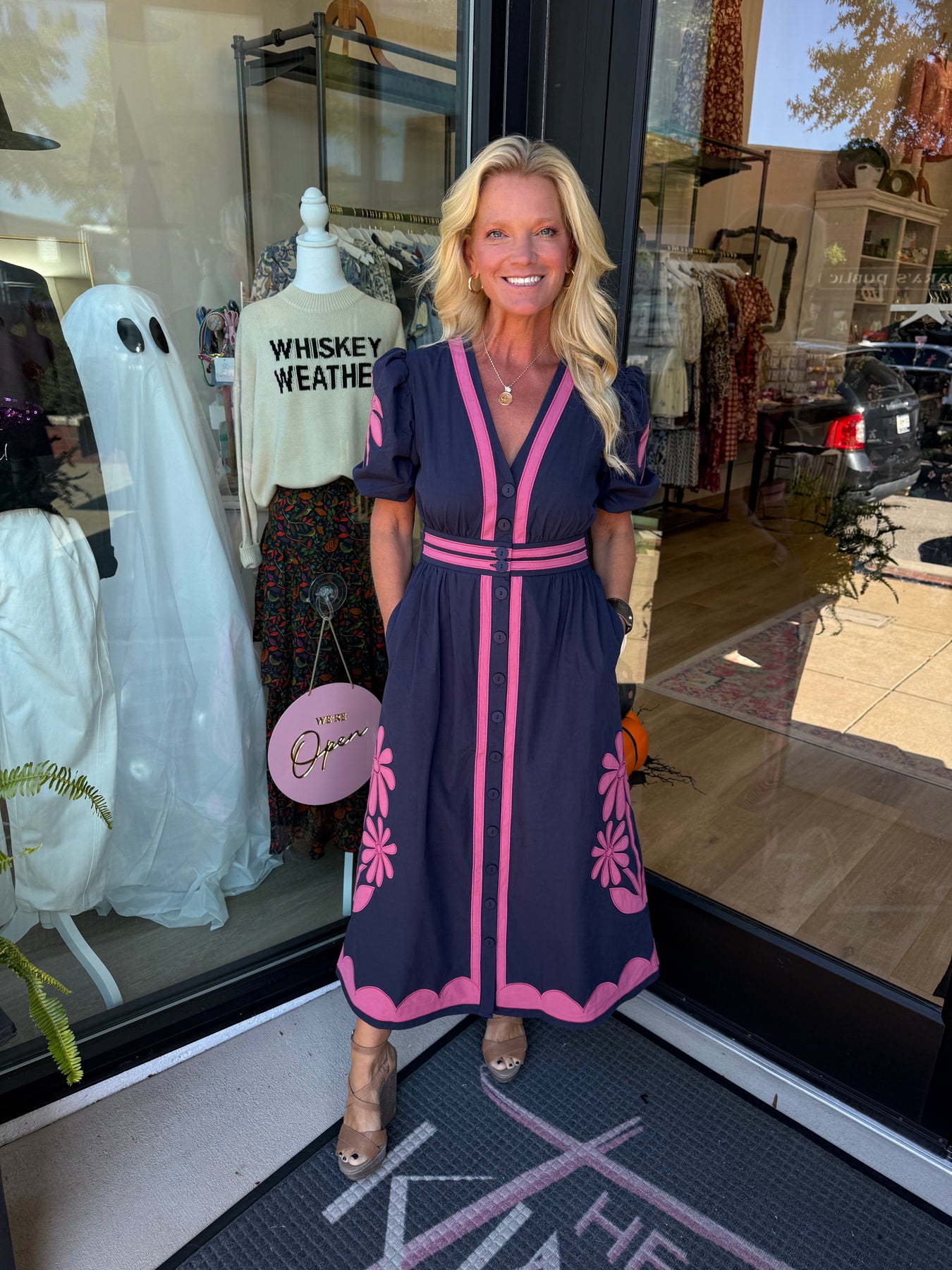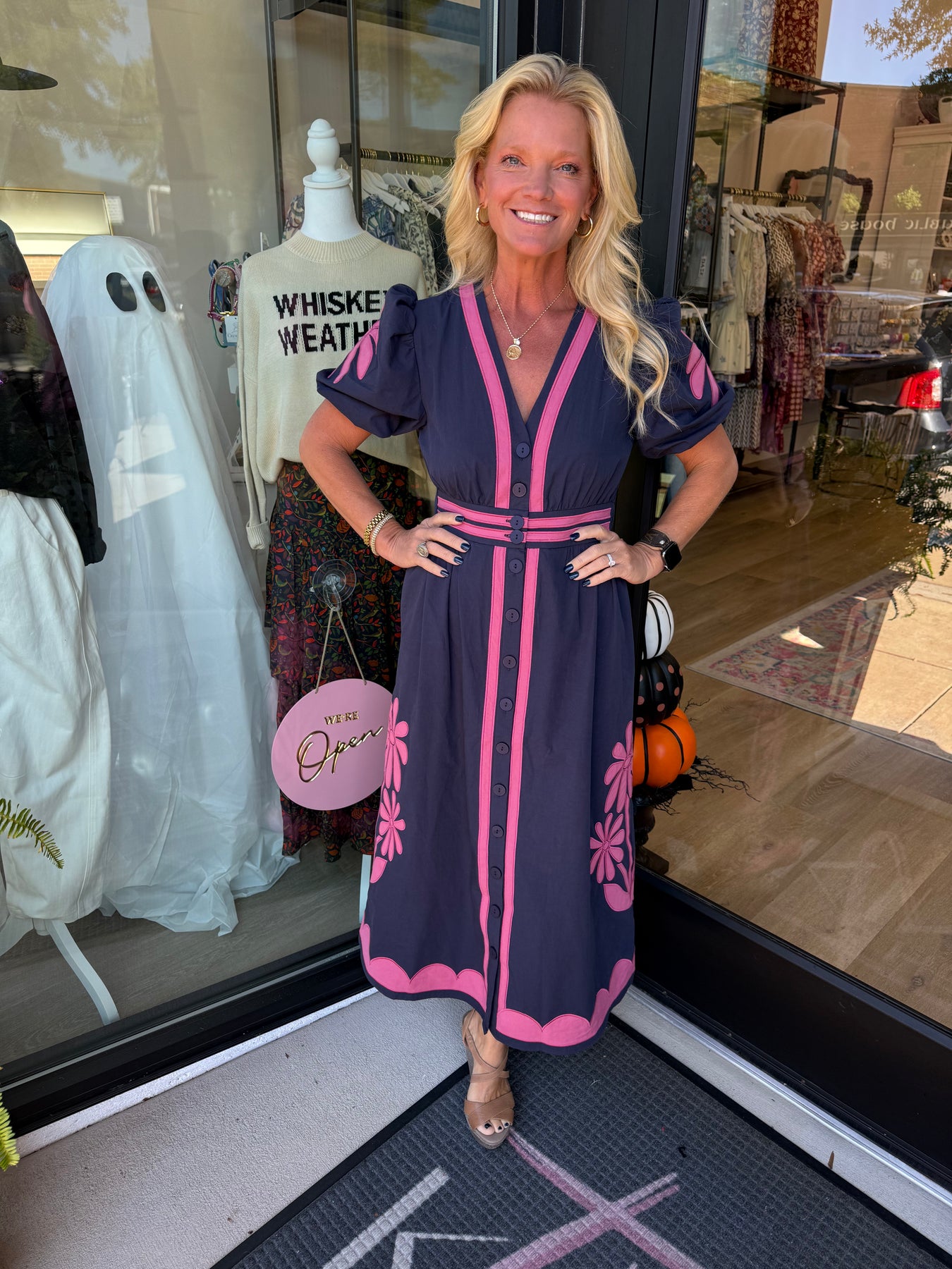 This long dress features intricate floral patch embroidery work throughout, a classic V neck, cinched waist with elastic back, side pockets, puff short sleeves, button down closure at front, and lining.