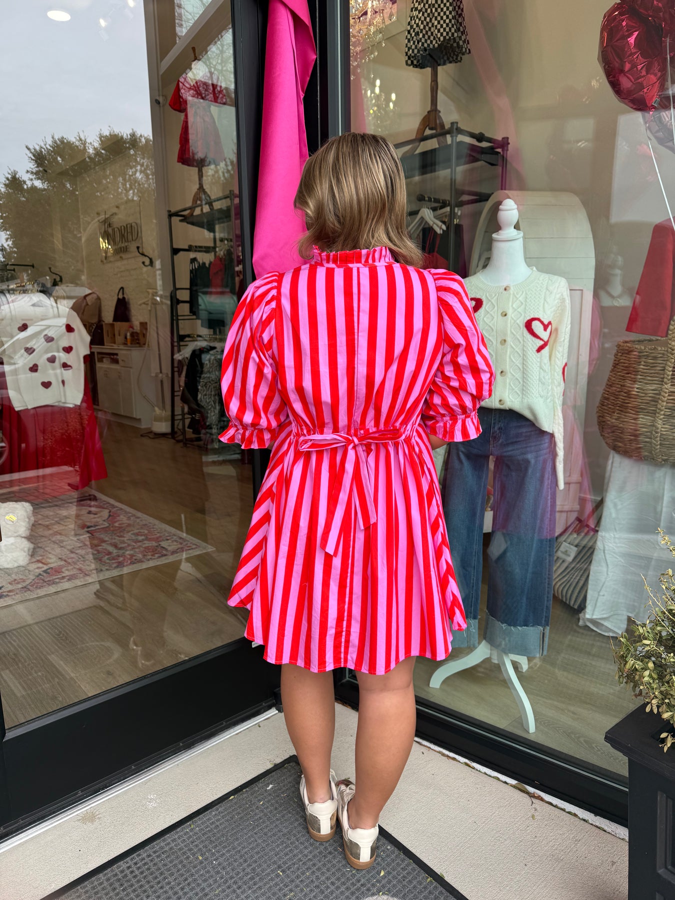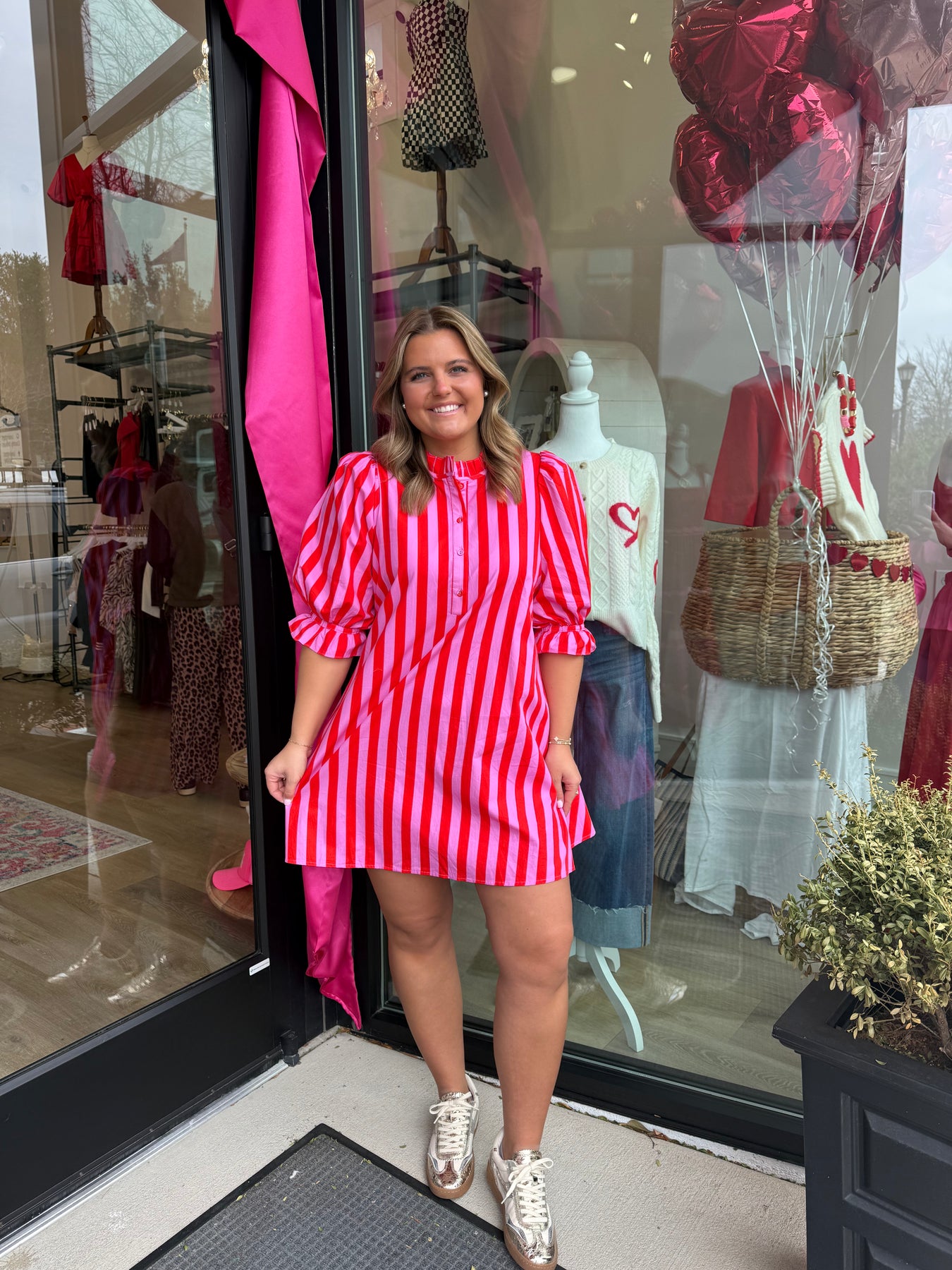 Striped 3/4 puff sleeve mini dress featuring ruffled band collar and partial button closure at front.