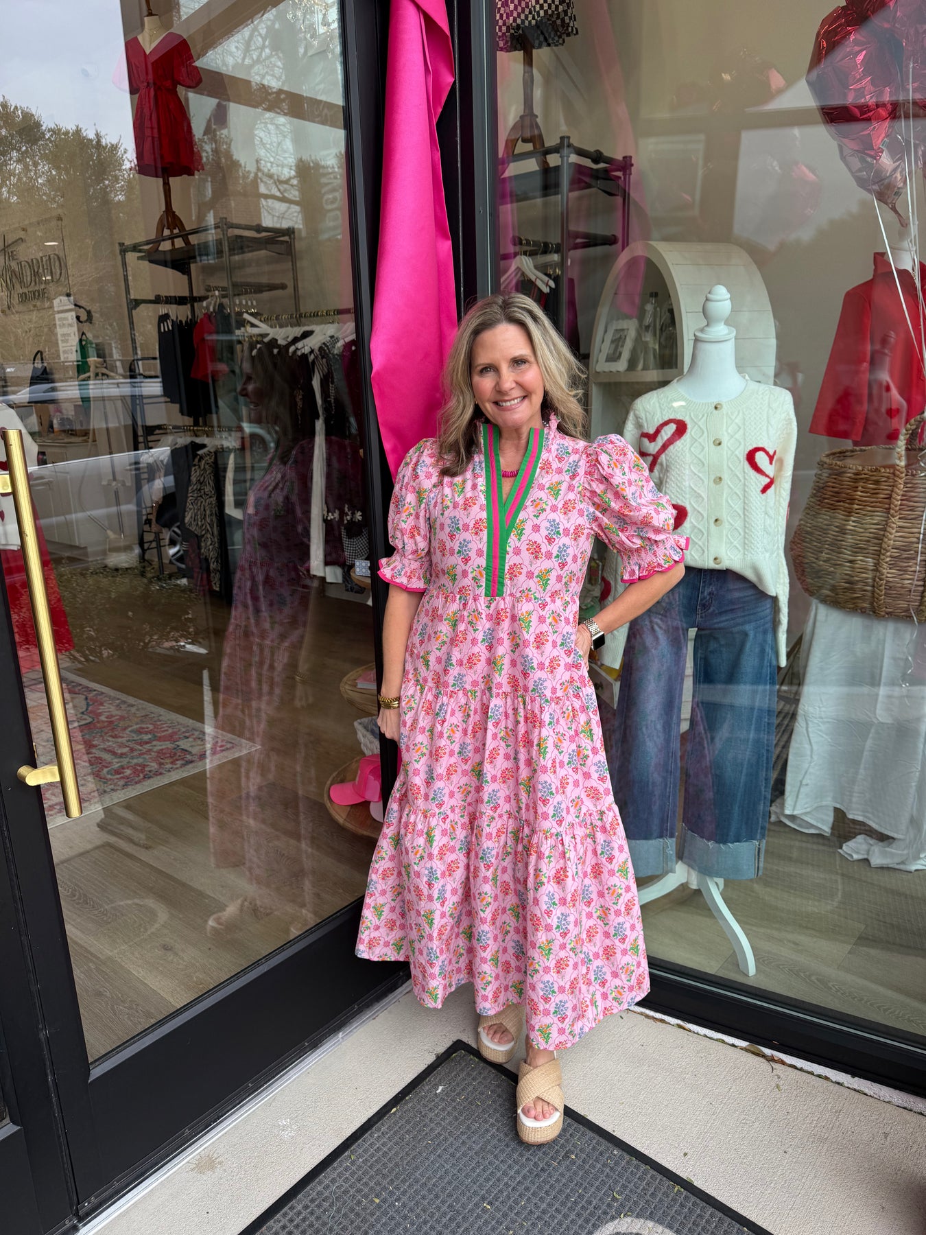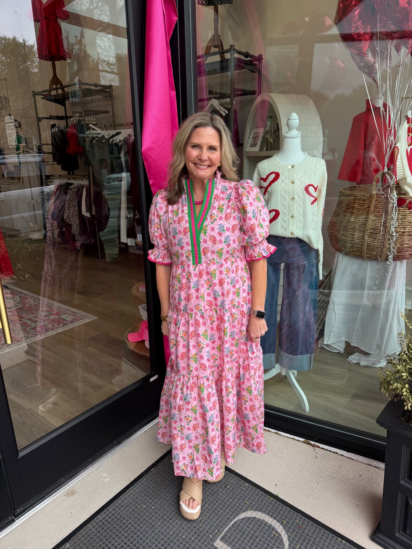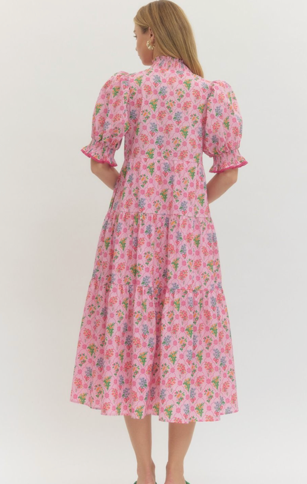 Floral print puff sleeve midi dress featuring contrast trim at neckline and cuffs.