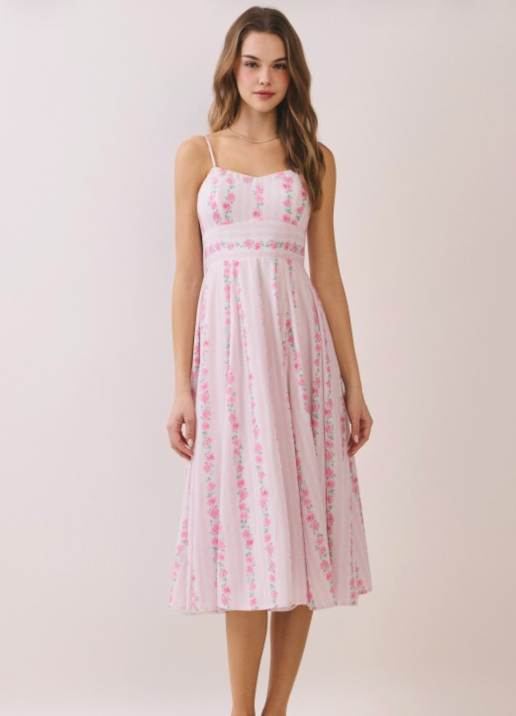 A floral-print midi dress featuring an adjustable spaghetti straps and a flattering empire waist.