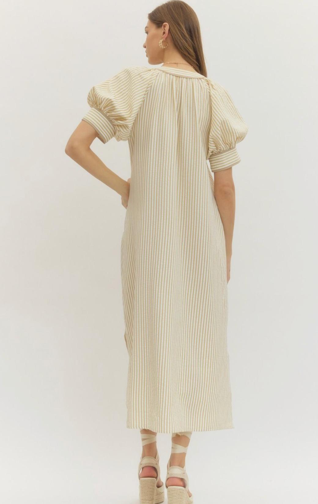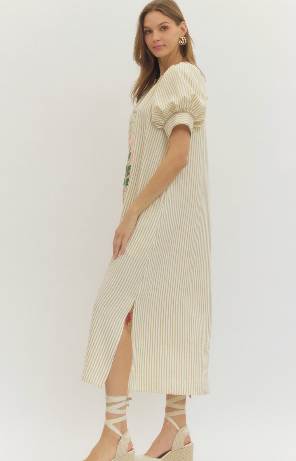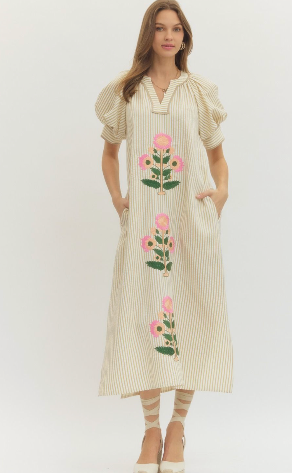 Stripe short sleeve midi dress featuring floral embroidery at front and band collar with V-cut neckline.