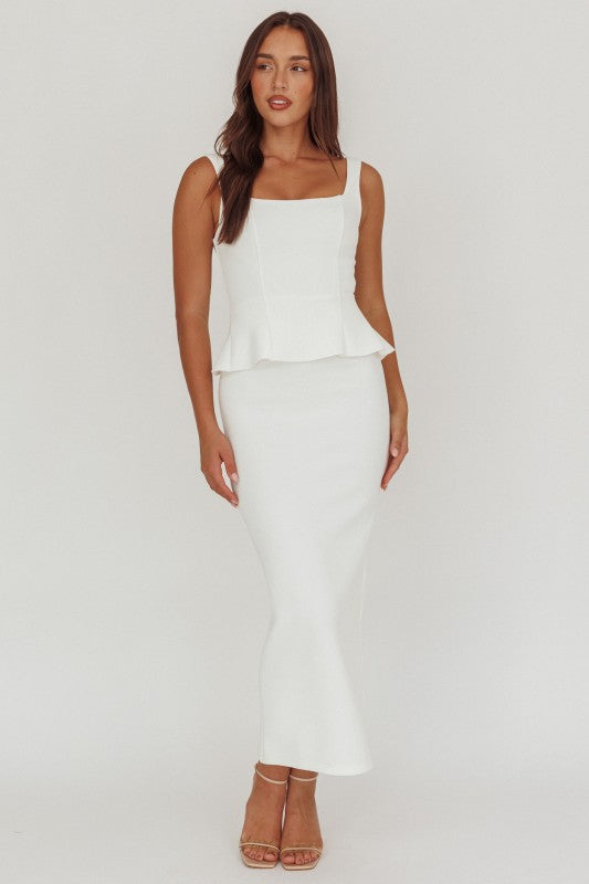 The skirt is a matching white, form-fitting design that extends to mid-calf, creating a sleek and elegant silhouette.