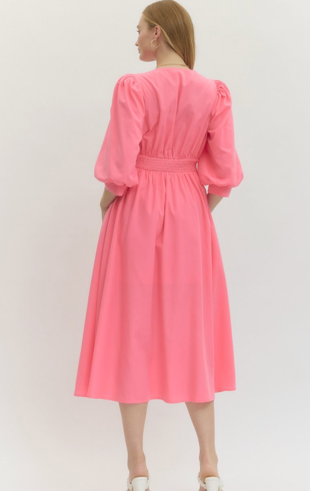 Solid ¾ sleeve midi dress featuring smocked waistband.