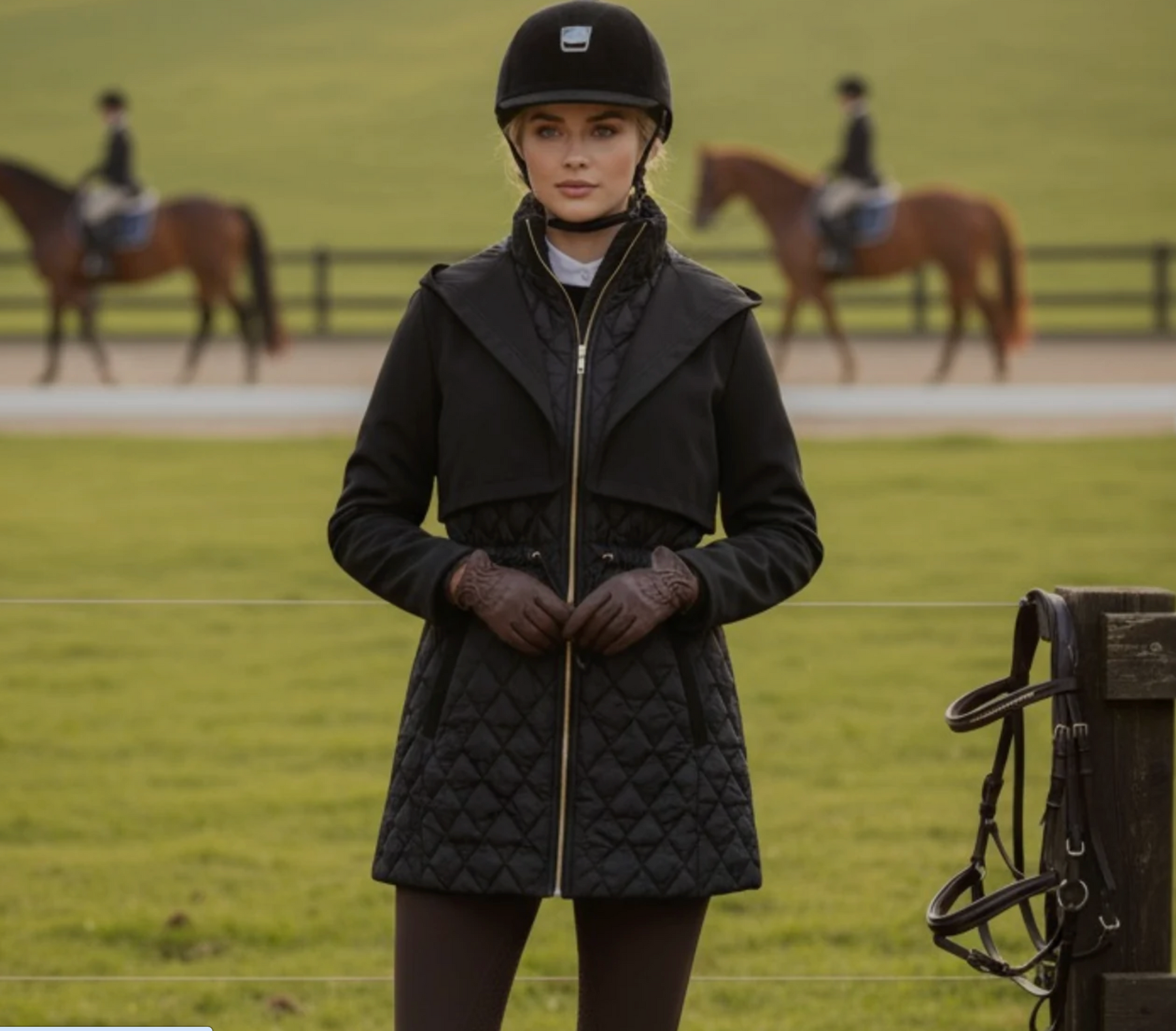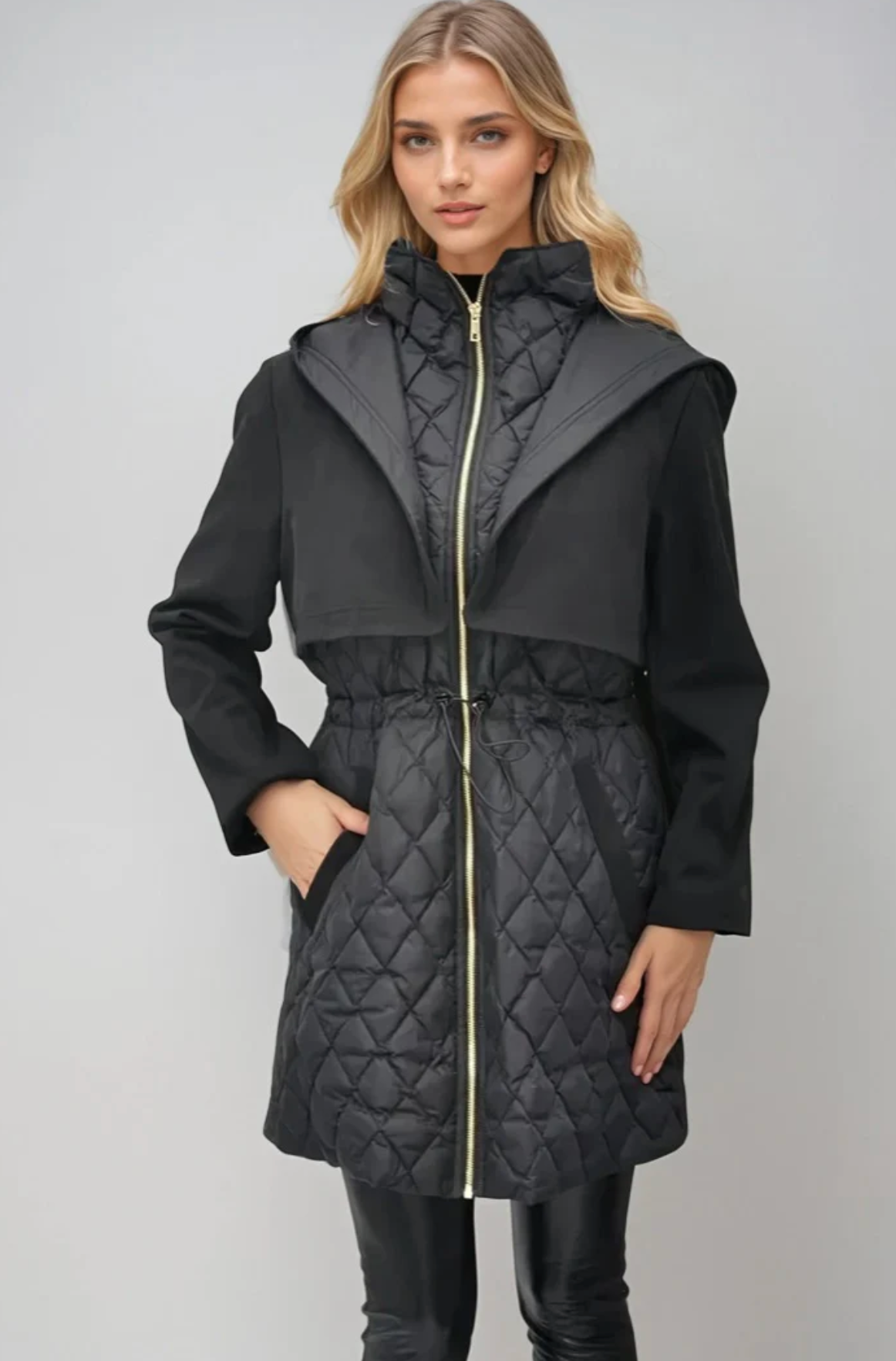 - Daria - Scuba fabric for extra warmth and style. Down quilted diamond duck filled down. Lay down hood.
