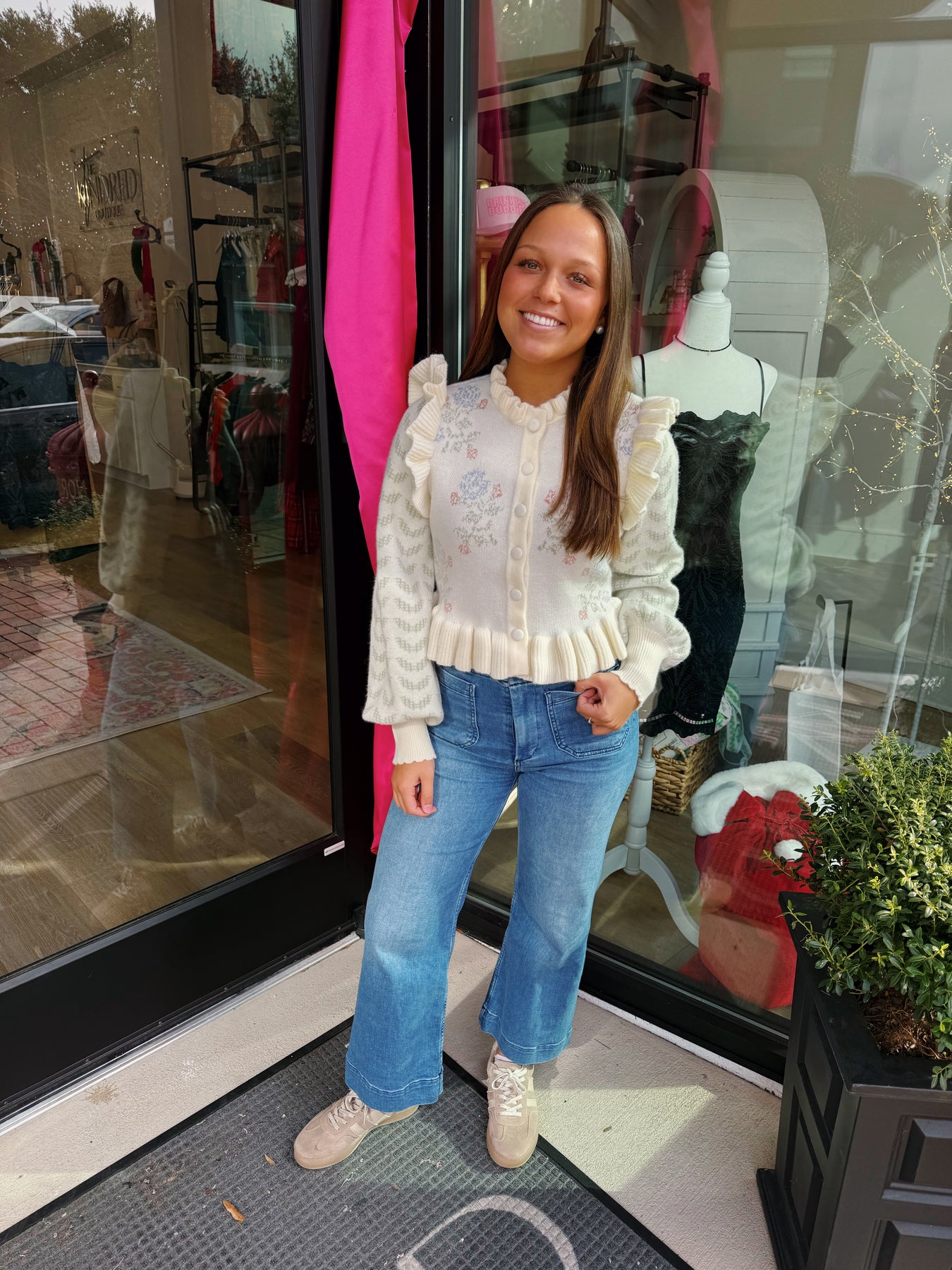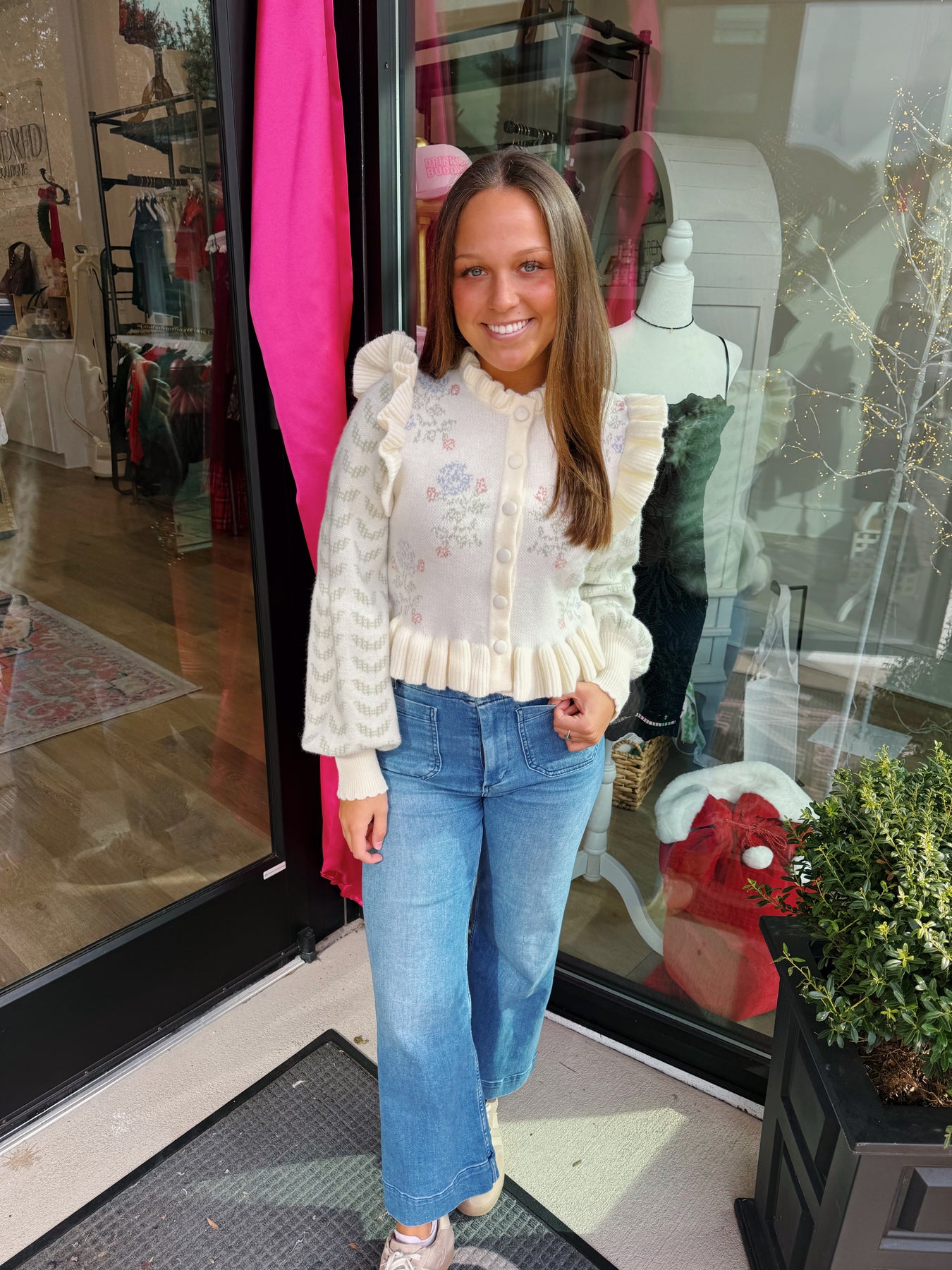 Ruffle Shoulder Floral Knit Cardigan Jacket