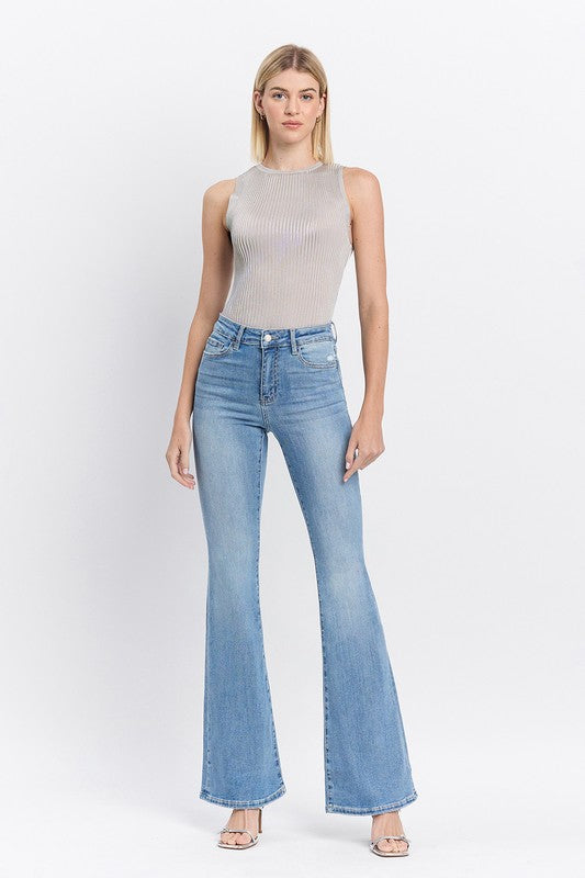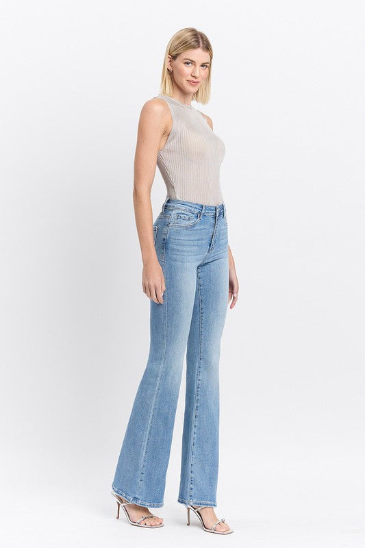 COMFORT STRETCH DENIM, HIGH RISE WAIST, 5 POCKETS, FINISHED HEM, FULL LENGTH, MEDIUM LIGHT WASH, FLARE JEANS