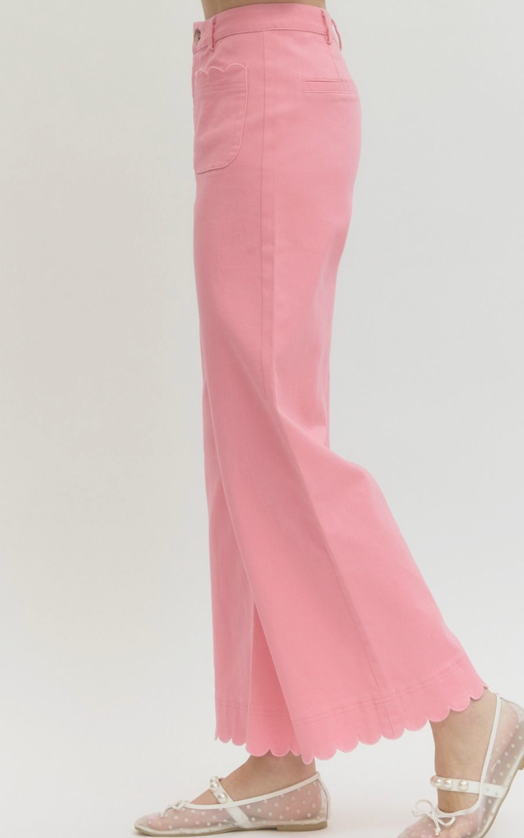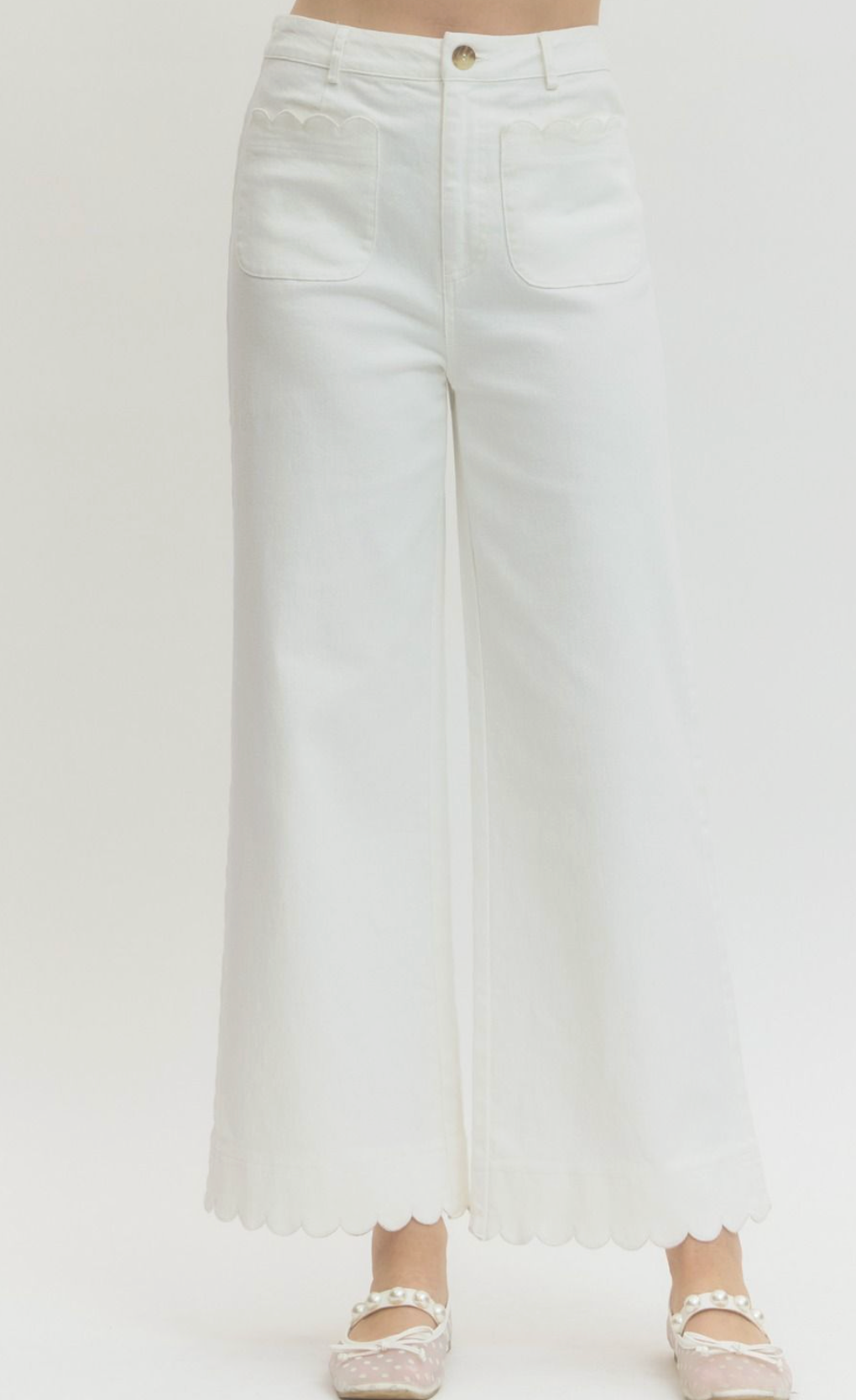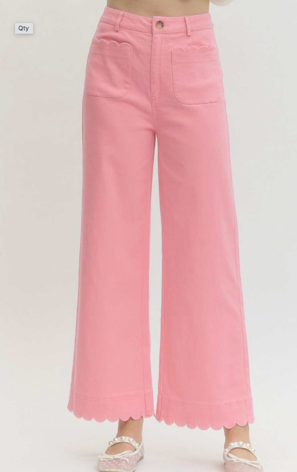 Solid high waist wide leg pants featuring scallop trim at pockets and hem.