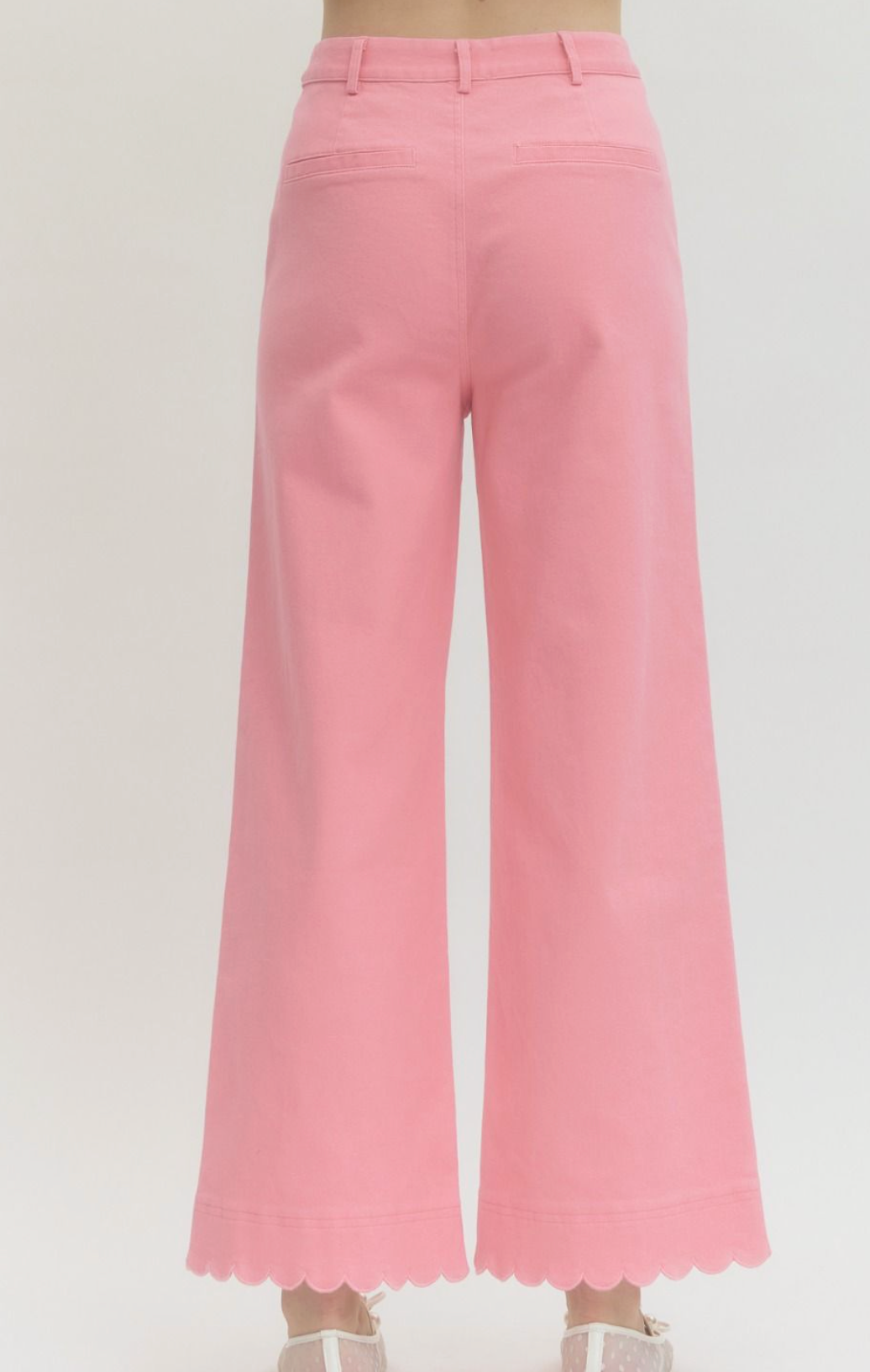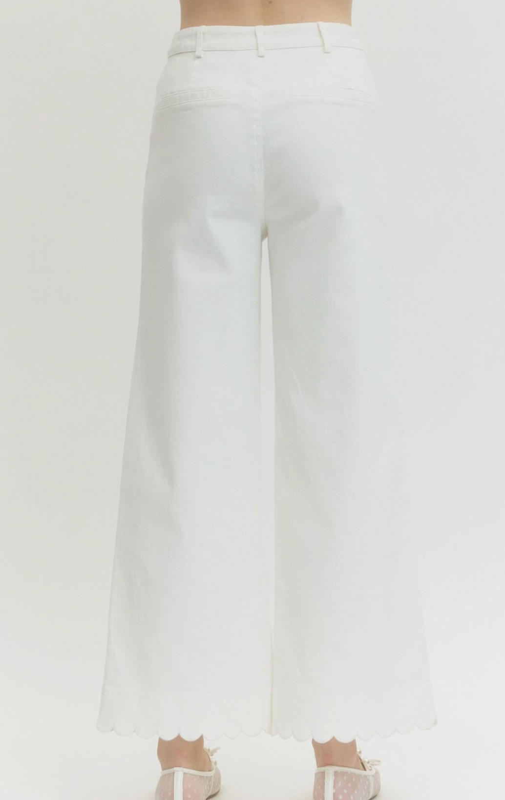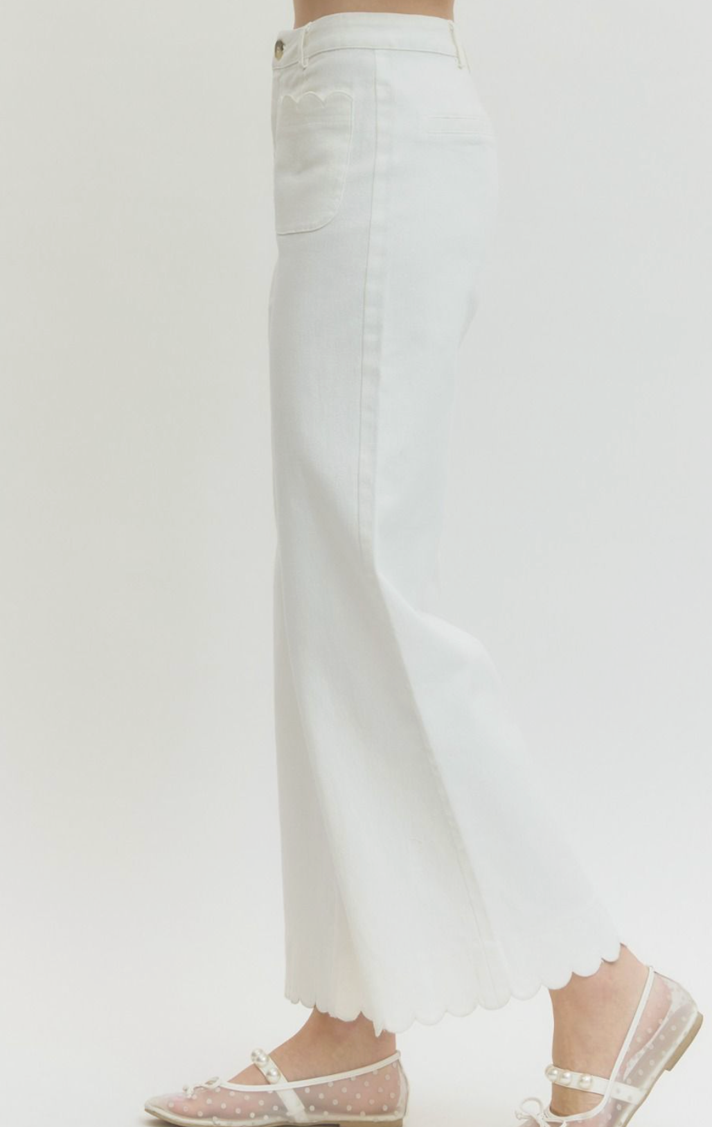 Solid high waist wide leg pants featuring scallop trim at pockets and hem.