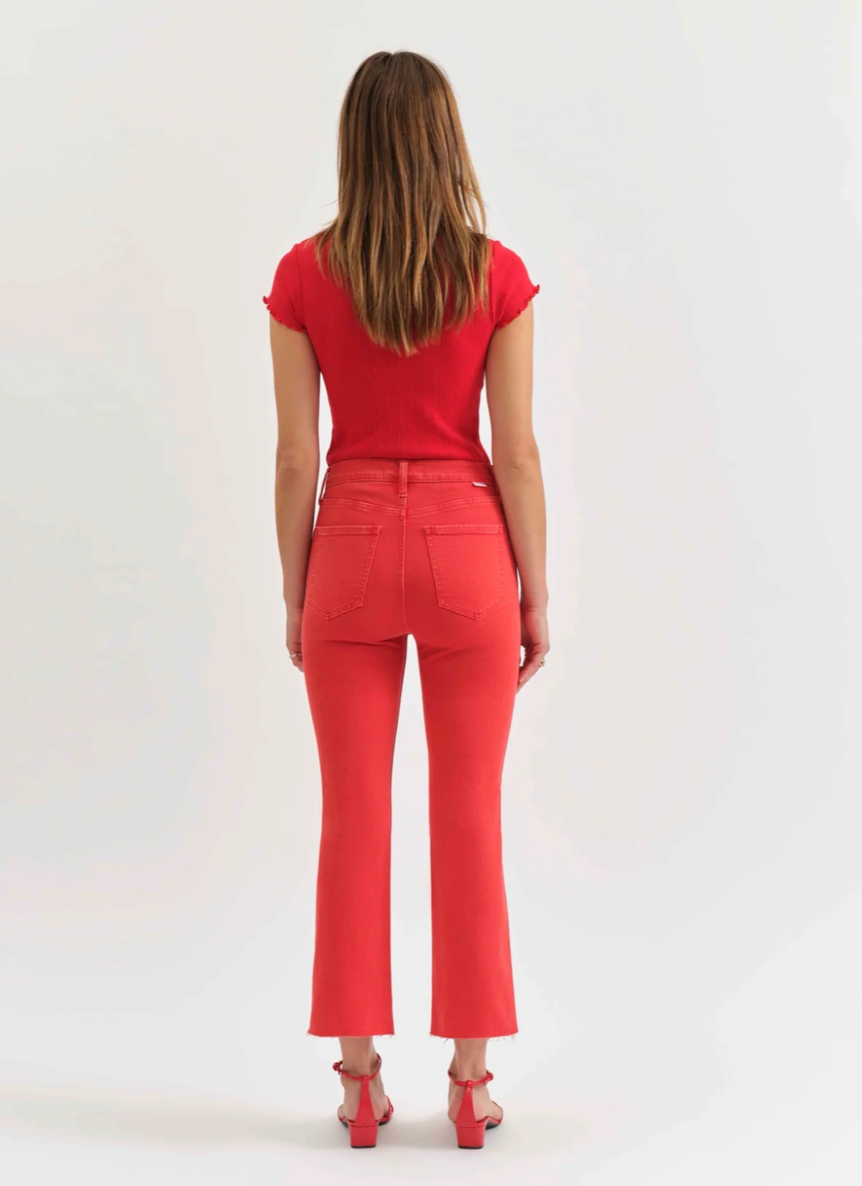 • The Shy Girl in Cherry is a flirty high rise cropped kick flare jean in a vibrant cherry red hue. Pair with the Lily Baby Tee in Cherry for a bold monochromatic look. This statement jean is constructed from our Just Right fabric, a reliably flattering cotton blend that provides the perfect mix of rigid and stretch.