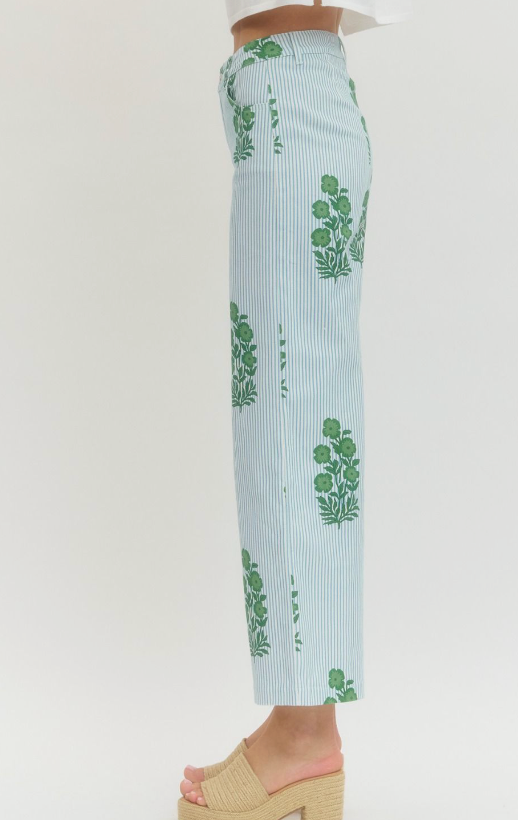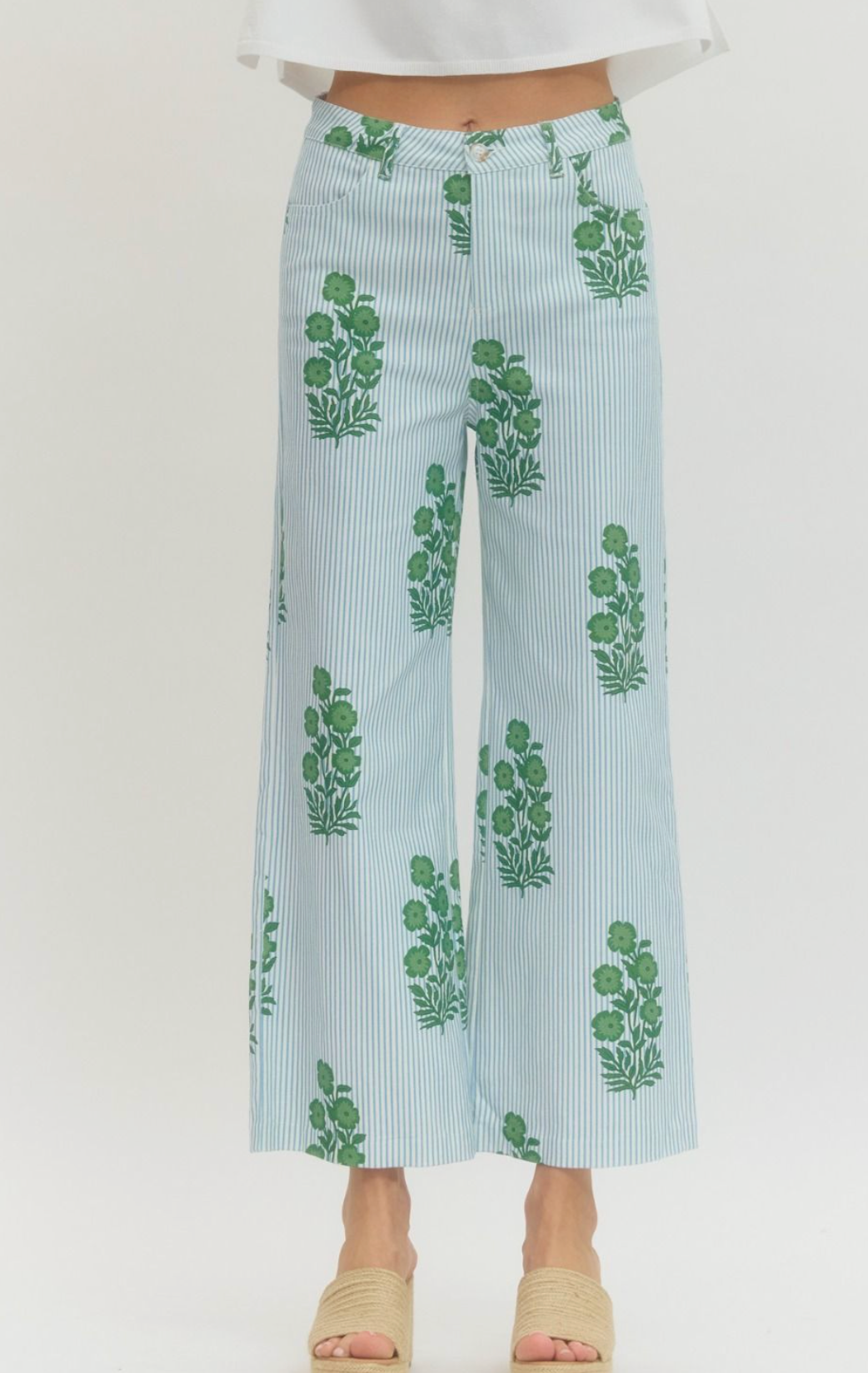 Striped floral print wide-leg pants featuring zip-fly button closure and side pockets.