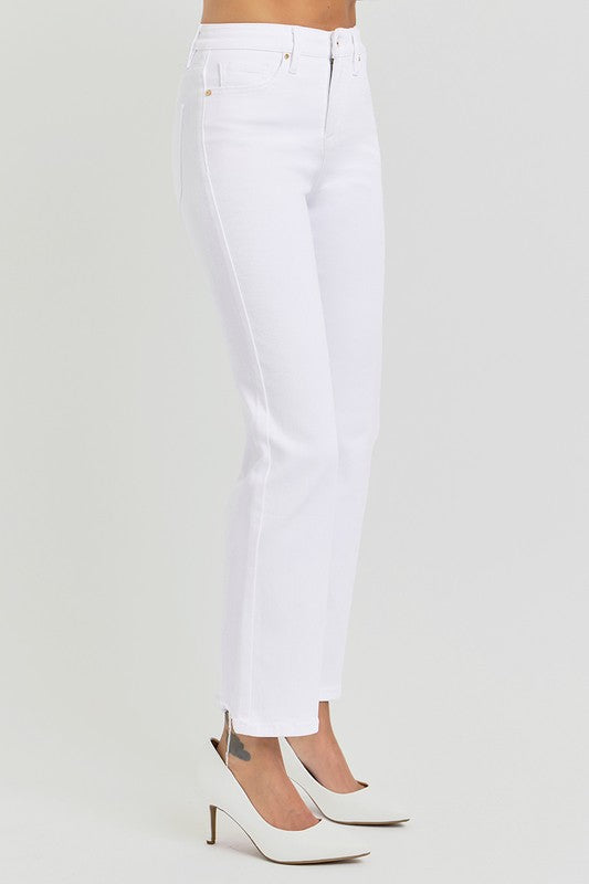White Tummy Control Elastic Band High Rise Crop Straight Jean