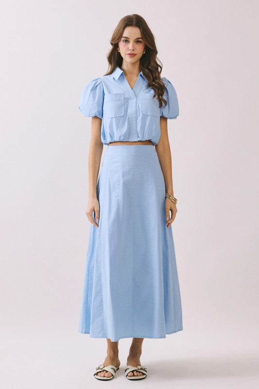 Cropped poplin shirt with bubble sleeves and contrast topstitching throughout.