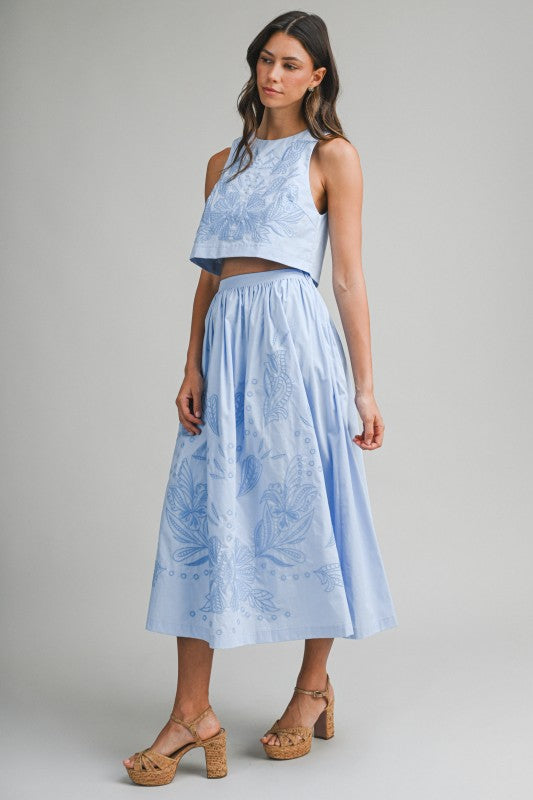 Tone to Tone embroidery sleeveless crop top and matching midi skirt set.