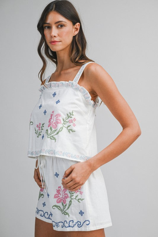 Paired with matching embroidered drawstring shorts finished with scalloped hem detailing.