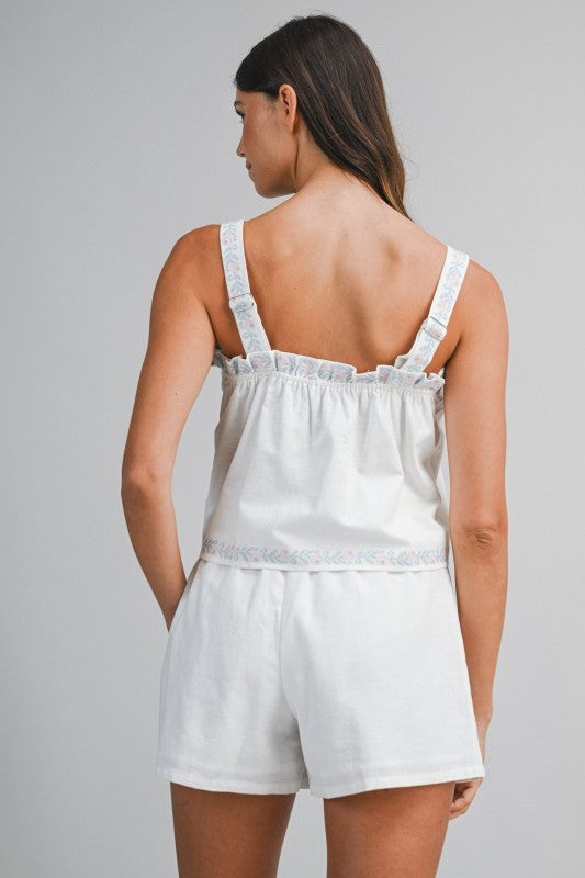 Two-piece set featuring a sleeveless square-neck top with ruffled trim along the neckline and straps.