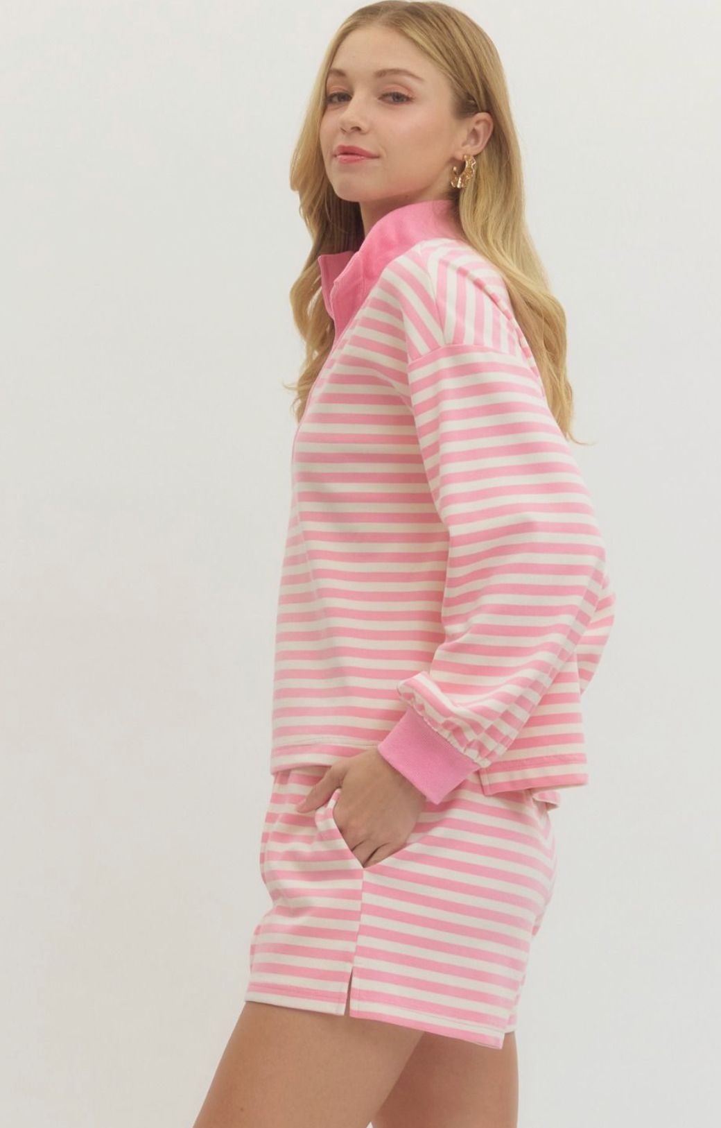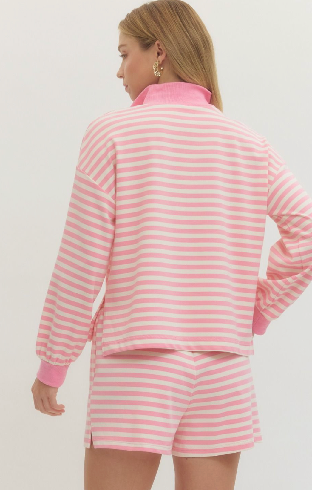 Striped long sleeve knit top featuring contrast split V-neck collar and ribbed cuffs.