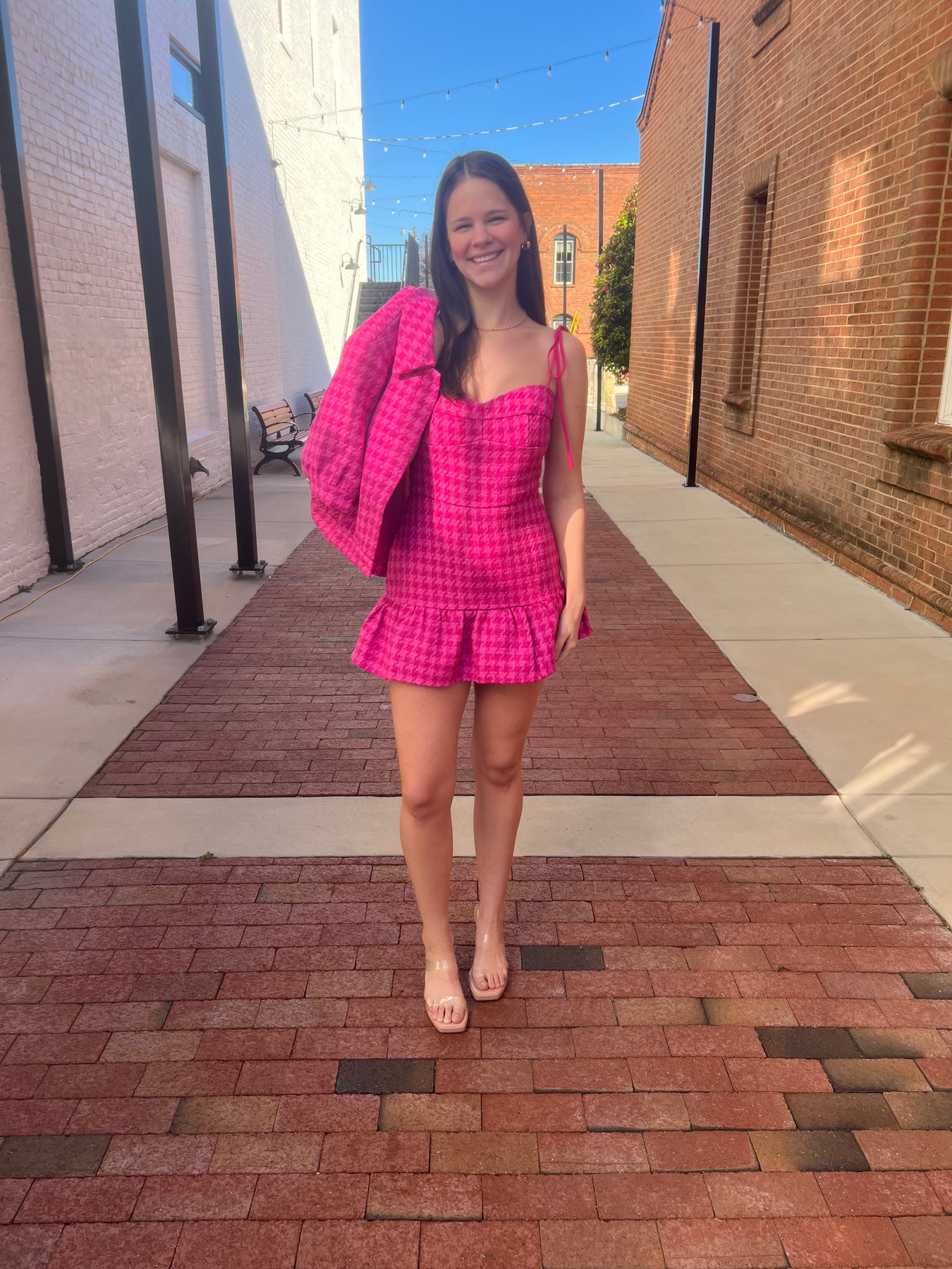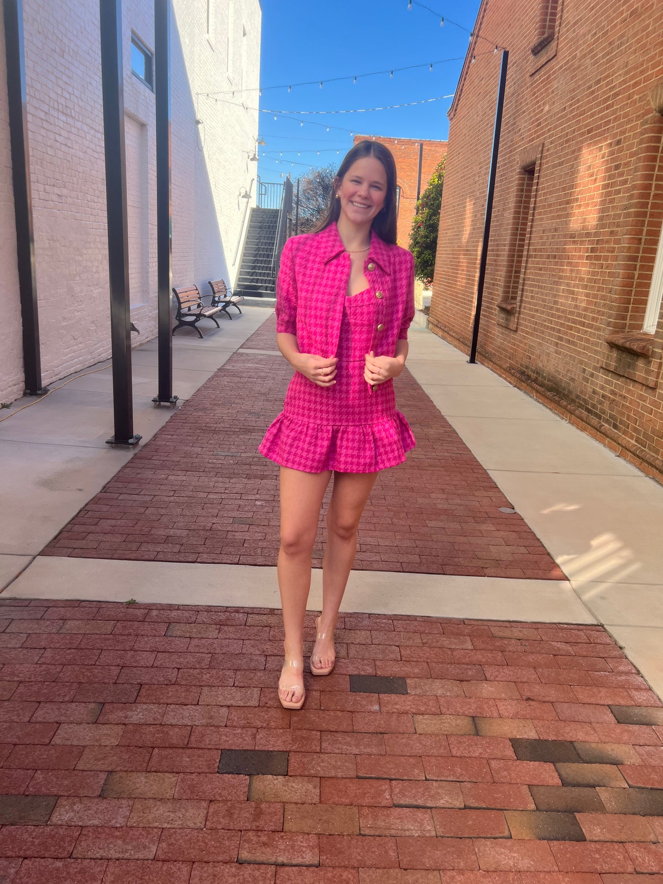 Turn heads like Elle Woods in the Vivi Romper, crafted from hot pink tweed for that perfect pop of color all year round. This playful dress romper blends bold style with comfort, making it ideal for fun days now and festive nights into the holidays. Brighten up your wardrobe with a touch of charm and confidence!