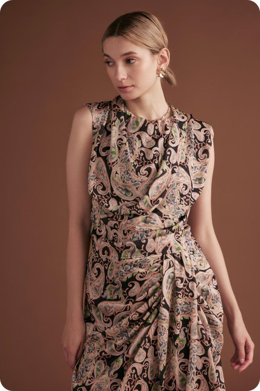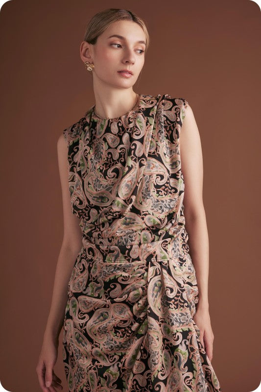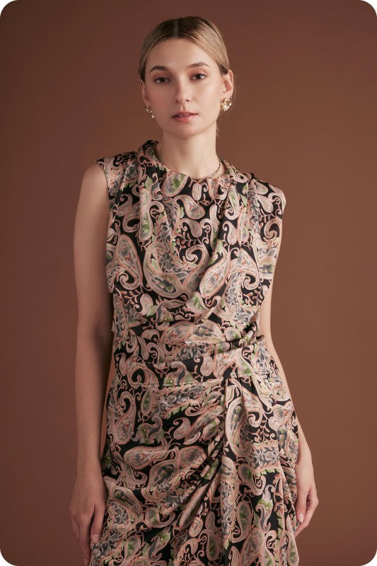 Draped neckline sleeveless top in an exclusive black, tank and green paisley print on satin fabric