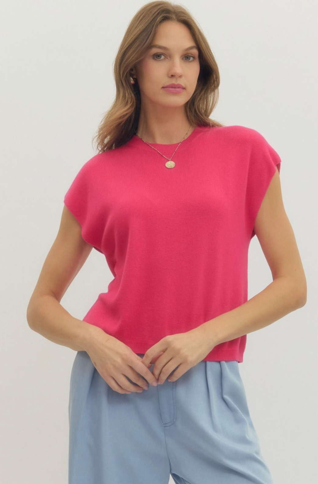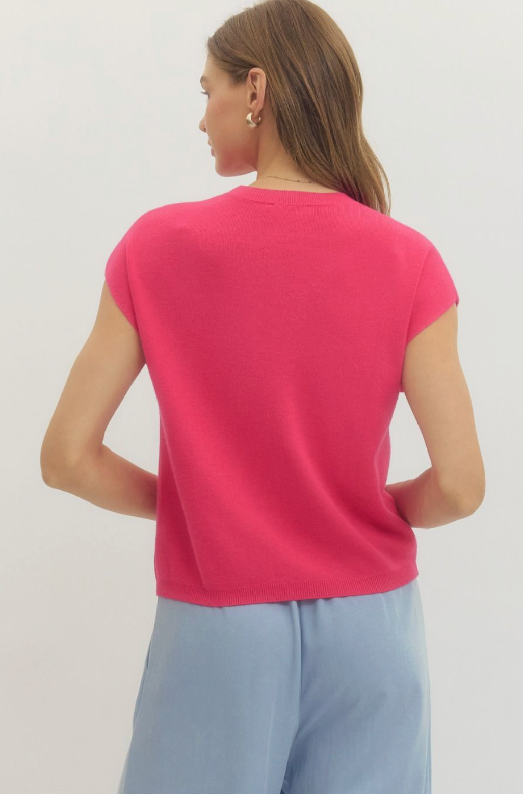 Solid cap sleeve knit top featuring round neck.