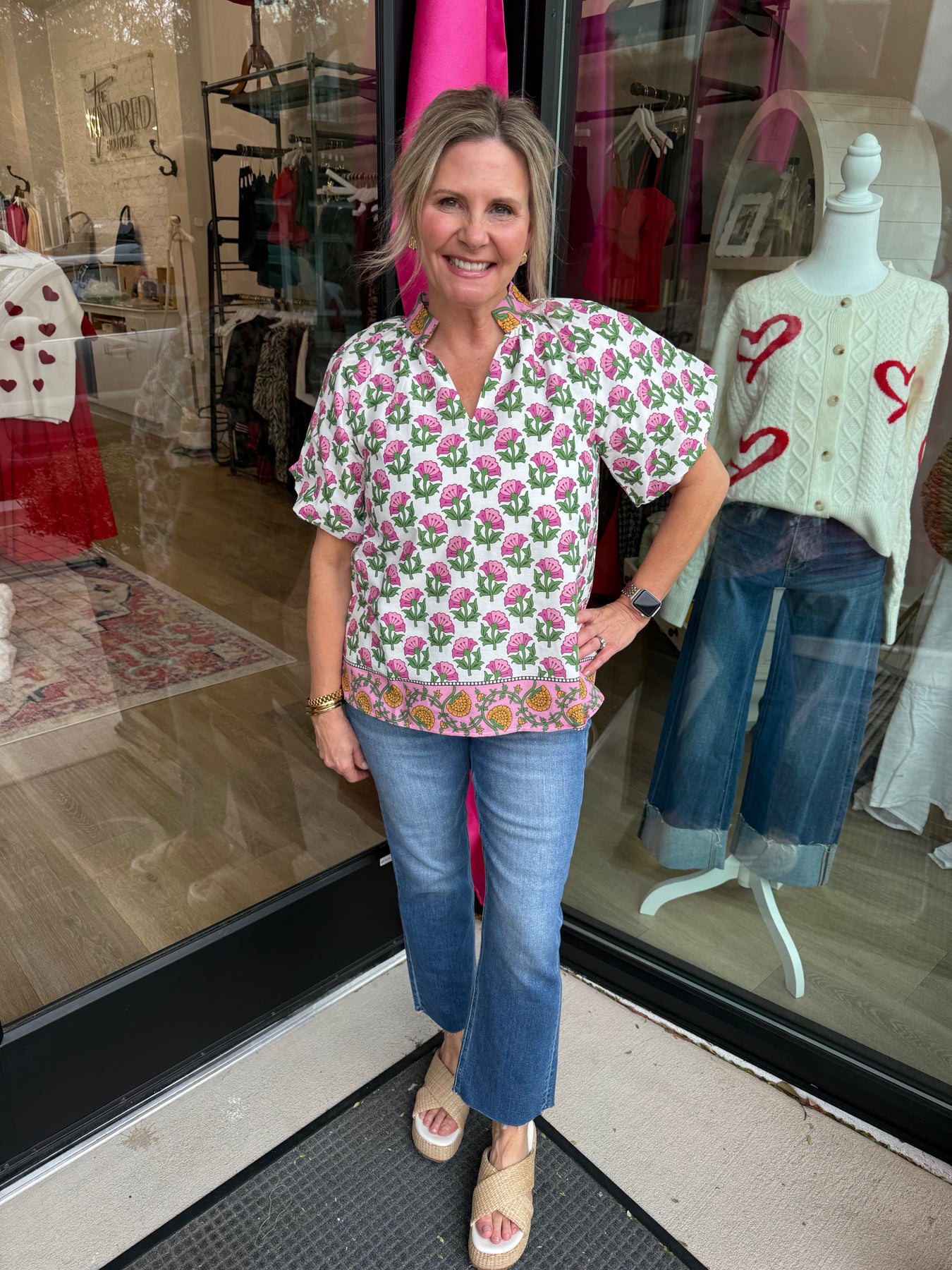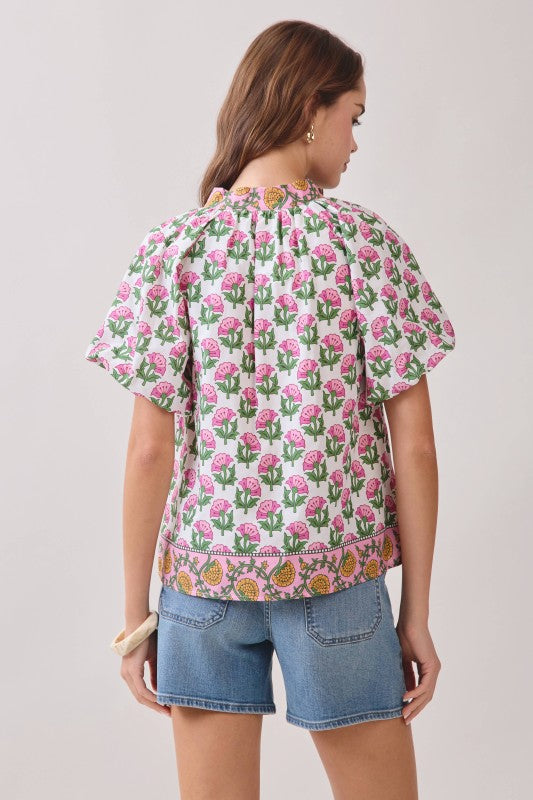 A floral printed top featuring bubble sleeves and a detailed border hem.