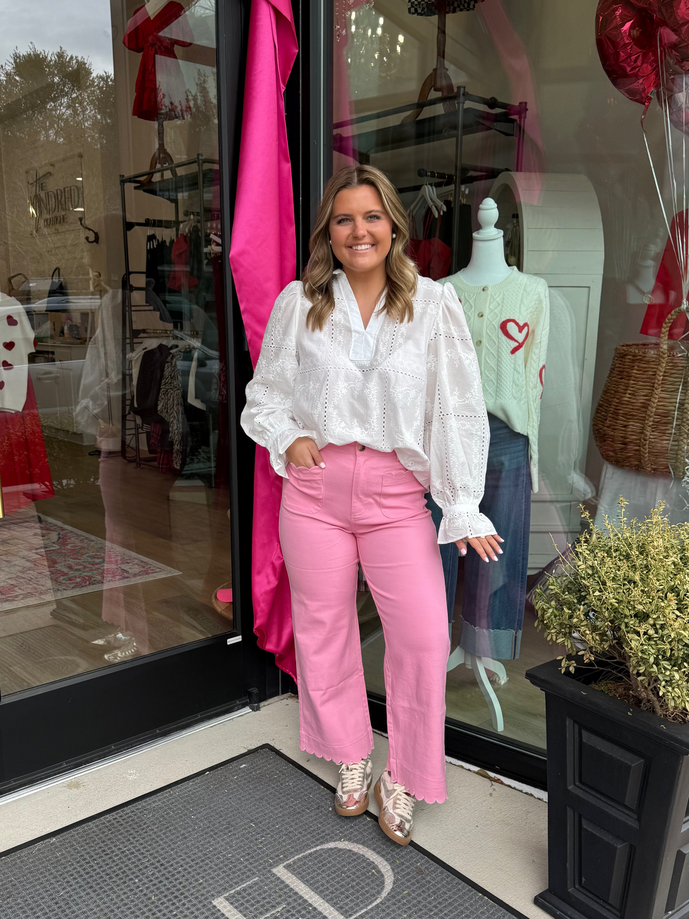 Embroidered long sleeve top featuring scallop trim and eyelet cutout detail.